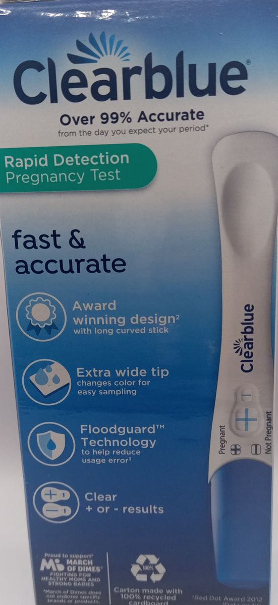 Clearblue Rapid Detection Pregnancy Test has an extra wide Color Change Tip that turns pink when urine is being absorbed, to let you know you have hit the target. It is over 99% accurate from the day of your expected period and provides easy-to-read, clear, plus (+) or minus (-) results, giving you confidence in the results. It also provides fast results, detecting pregnancy as fast as 1 minute when testing from the day of your missed period. However, wait 3 minutes to confirm both negative and positive results. The unique FloodguardTM Technology helps reduce the #1 reported cause of user error by keeping excess urine from flooding the test strip.