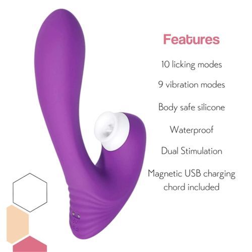 This silky soft body-safe silicone toy is designed to stimulate your G-Spot and clitoris at the SAME TIME! Similar to a rabbit-style vibrator, but with the new stimulation of a real wet, licking tongue.