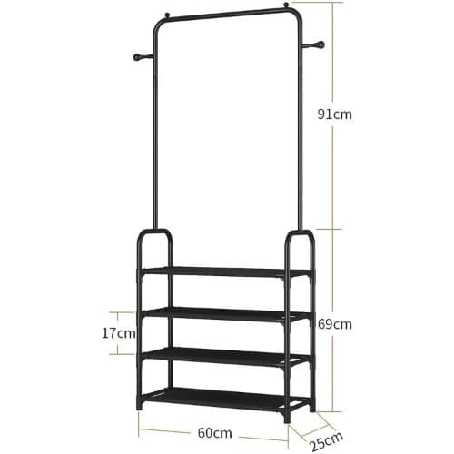 The rack offers you enough room to put away your garments. Shoes and boxes can put on the lower two shelves while the hooks on the side can be used to hang hats and coats.