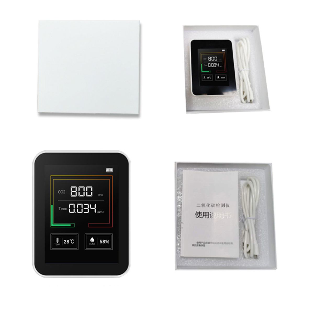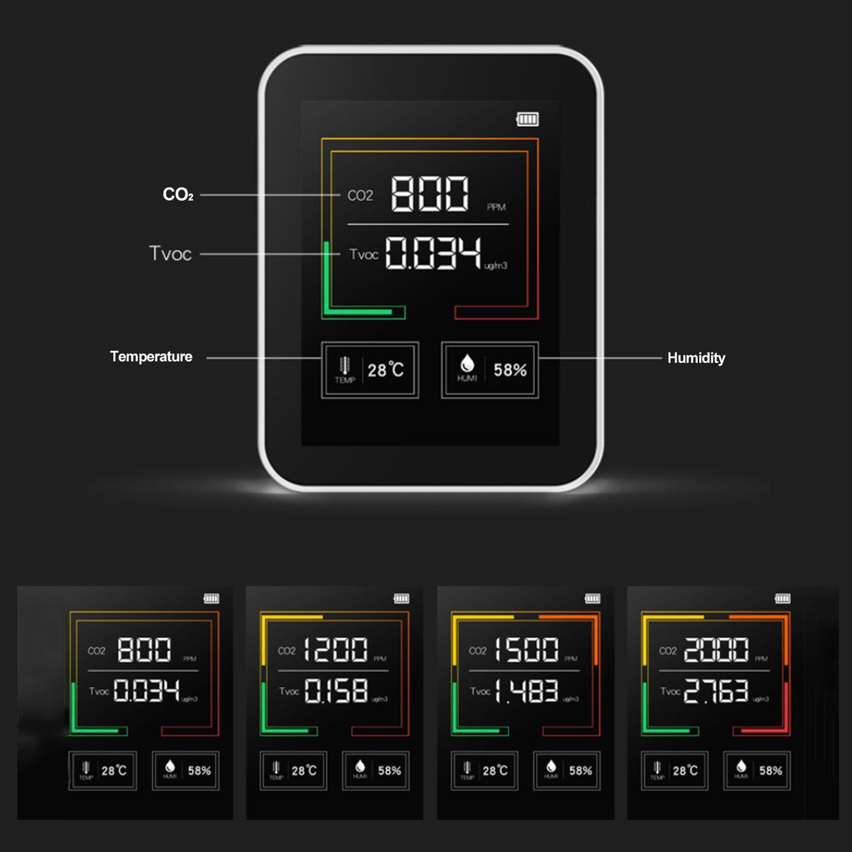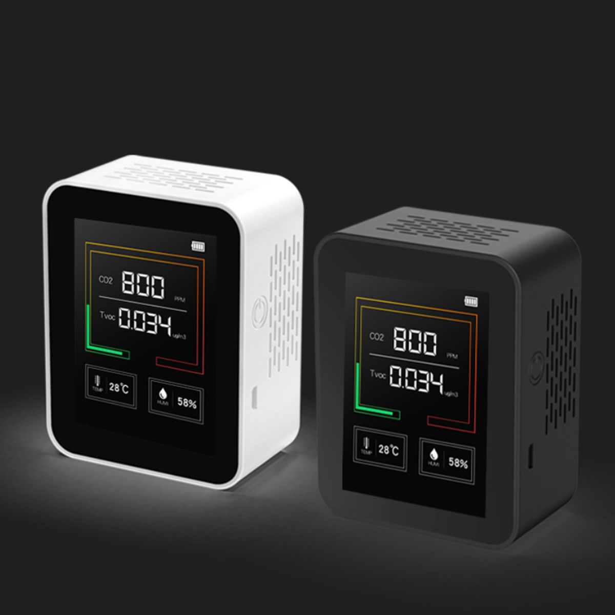 This is a kind of air quality detector, which can be used to test temperature and humidity and CO2 concentration. Equipped with large digital display with backlight, you can see the remaining electrical amount, CO2 value, temperature and humidity data clearly. The color circle will change (green-orange-red), according to the CO2 and TVOC data.