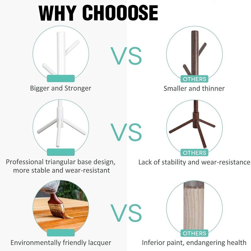 SOLID CONSTRUCTION - This Free standing coat hanger is made by real wood coated with environmentally friendly lacquer, which is waterproof, anti-corrosion and non-toxic.