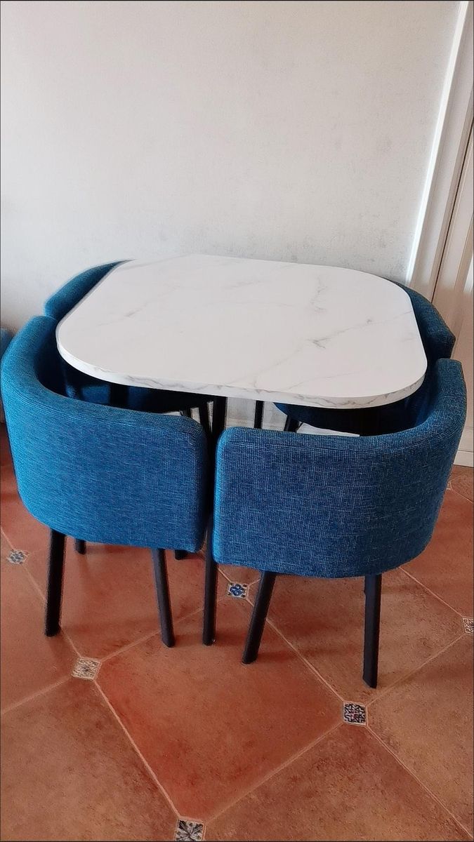 This exquisitely designed dining/coffee set is made up of one 4 seater coffee table and 4 well cushioned fabric dining chairs. It comes in blue quality fabric colour chair variants to match any living room upholstery. It has very attractive hue which is pleasant to the sight and great for every dining/coffee rooms. The edges of the table are folded for child safety at and round dining room. the middle of the table top are also very thick.