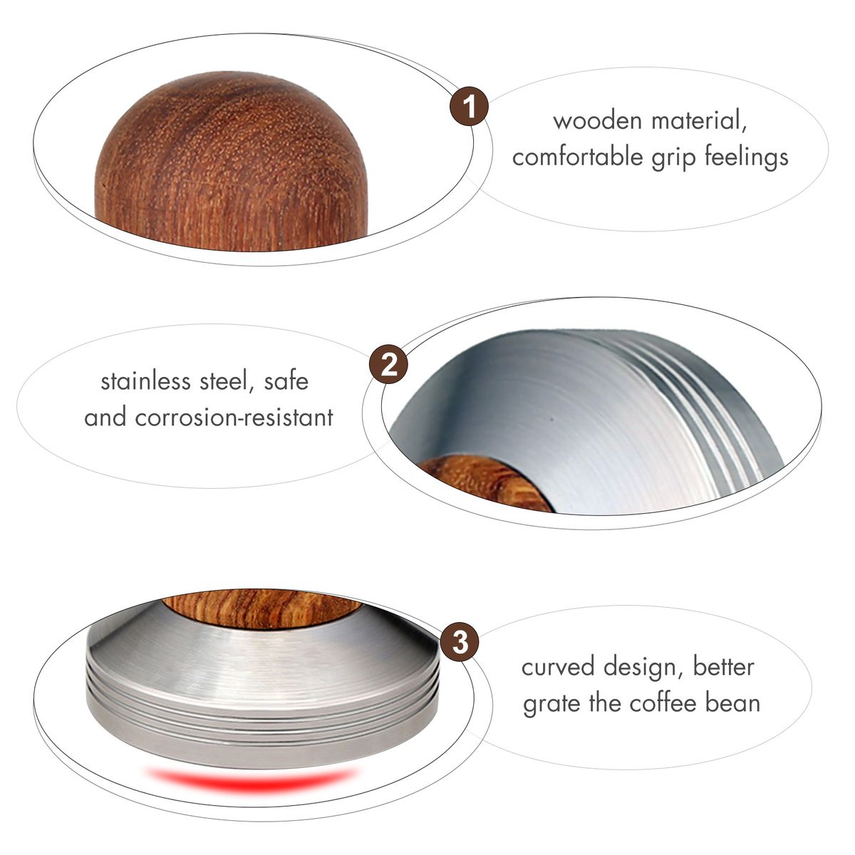 The handle is designed in wooden material, and the bottom base is a curved design, which can better grate the coffee bean.