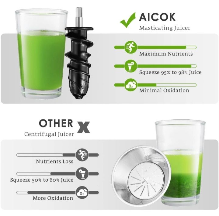 The Aicok Juicer is the best choice on the masticating juicer market. Lead a better life with better nutrition! Aicok has been studied household and kitchen appliance for decades, we specialize in the development,manufacture and sale of fashion kitchen products. Aims to manufacture the best products and is ready to be a new leader in the appliance field.We're committed to creating solid & high-quality products backed by the liberation of the kitchen.