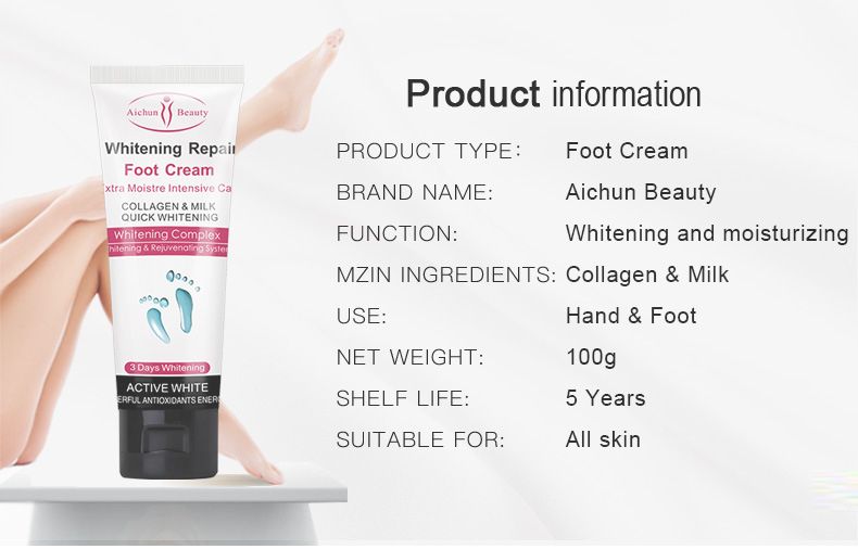 mageBrightening foot cream. Skin whitening. Fresh and not greasy. Moisturizing. Give your feet a well-groomed and beautiful look. Helps repair cracked skin. Hydrates and brightens skin. Nourishes the skin. A nourishing moisturizing milk. Moisturizes and eliminates dryness. Replenishes reserves of moisture in the skin, makes the skin soft, fresh and hydrated. Beautiful and smooth skin. Improves the condition of dry skin, gives freshness fort, makes the skin silky and supple. Skin renewal. Improves skin condition, gently cares for sensitive skin, improves skin tone. Product information: product efficacy: the product restores and softens dry and rough skin, restores chapped skin and brightens skin tone. Suitable for skin: darkened skin, chapped, dry and rough foot skin. Method of use: apply the cream to clean foot skin and wait for 15 minutes plently absorbed, use 2-3 times a week. Gentle care for the delicate foot skin. Moisturizing. Skin whitening. Softening. Nutrition. Skin renewalMoisturize and soften the foot skin, and repair the coarse and dry feet.Let your feet get rid of rough, dry, chapped, calluses, have clear tender foot.Fresh and not greasy.Usage: 1. Clean your feet and dry. 2. Apply this foot cream. 3. Massage to promote blood circulation. 4.15 minutes to dry, 2-3 times a day. Daily use to prevent cracking.Net Content: 100ml Features: Foot Treatment, Whitening, Moisturizing