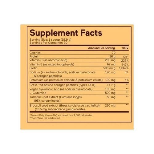 Ingredients: Hydrolyzed Fish Collagen, Hyaluronic Acid, Vitamin C, Biotin, Natural Flavor