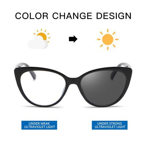 Intelligence Photochromic Lens :The lense will change color due to the intensity of the UV light. suffering the stronger sunlight, the glassess lense will be black; In cloudy day, it changes into gray; At room or night, it's transparent. The advantage of a photochromic lens is that you can wear your eyewear all day and can change your lenses color according to light conditions.