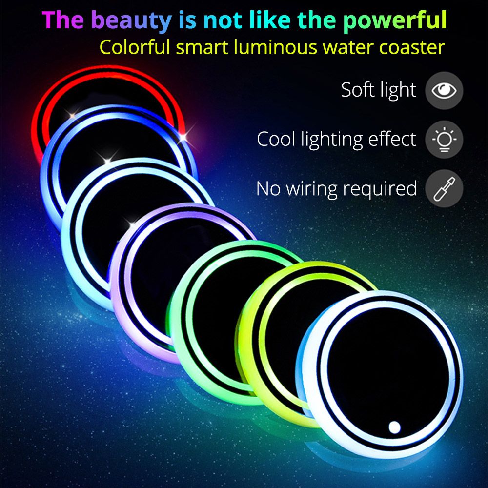Creative car cup mat with decorative RGB LED, makes your car cup holder looks cool and great,Low power consumption. Built-it sensitive light sensor and vibration sensor, this cup mat will automatically turn on at dark when it feels vibration, and turn off after about 15s. IP67 waterproof, easy to install, no tools and wiring needed, universal for all kinds of vehicles that come with car cup holder. (Please check the item size before ordering) Instructions: Long pre the button on the back to turn on / off the cup mat. Specifications: Charging function: USB charging Luminous color: led Color RGB (white, red, blue, green, yellow, purple, cyan) Diameter: 6.8CM Product net weight: 46g (1 set) (including 2 water cup mats and a USB charging cable) Package weight: 75G (2 pieces) Packing size: 9.5*9.5*3cm (2 packs) Includes: USB charging cable Material: imported high material acrylic Effect function: the cup seat acts as a luminous atmosphere Notes: Due to the difference between different monitors, the pictures may not reflect the actual color of the item. Compare the detail sizes with yours, please allow 1-5mm error, due to manual measurement. Please leaving a meage before you give the bad feedback, if the products have some problems. Thanks for your understandings