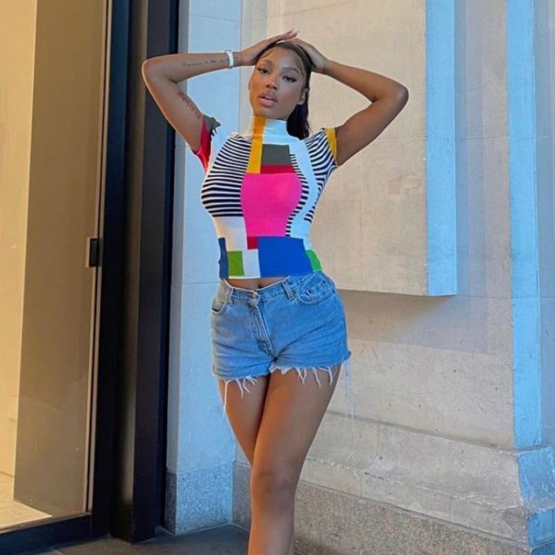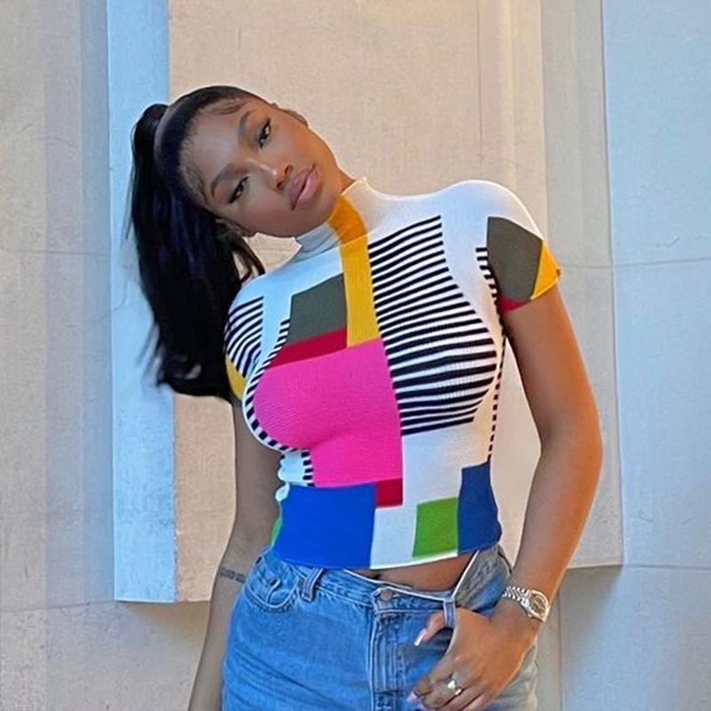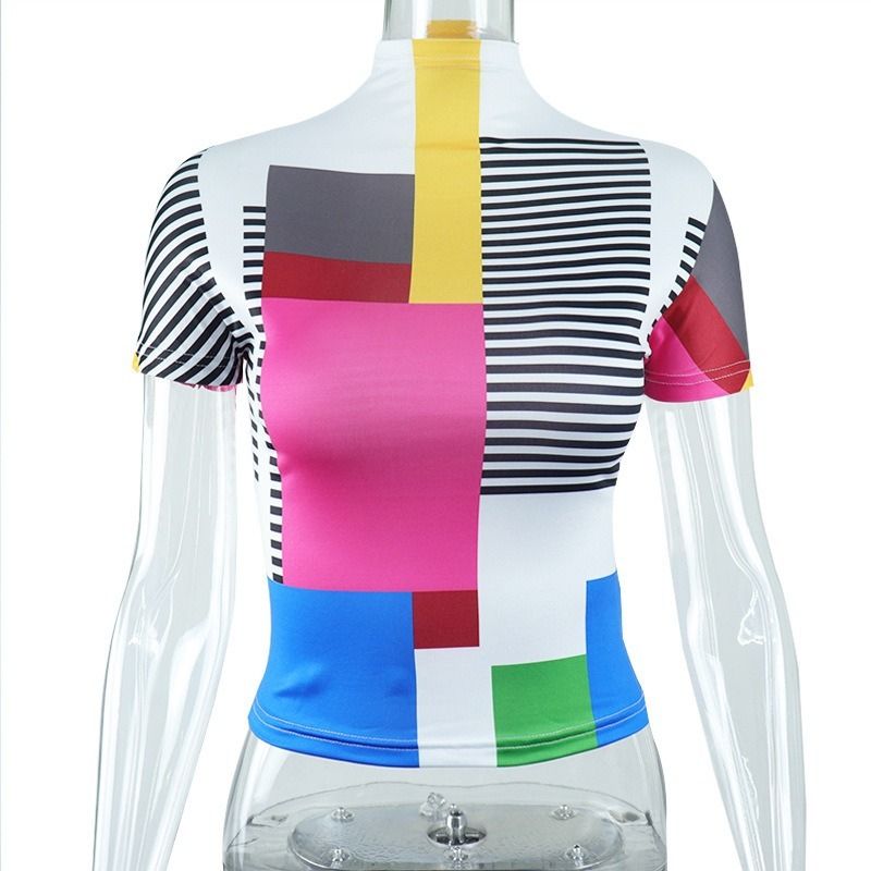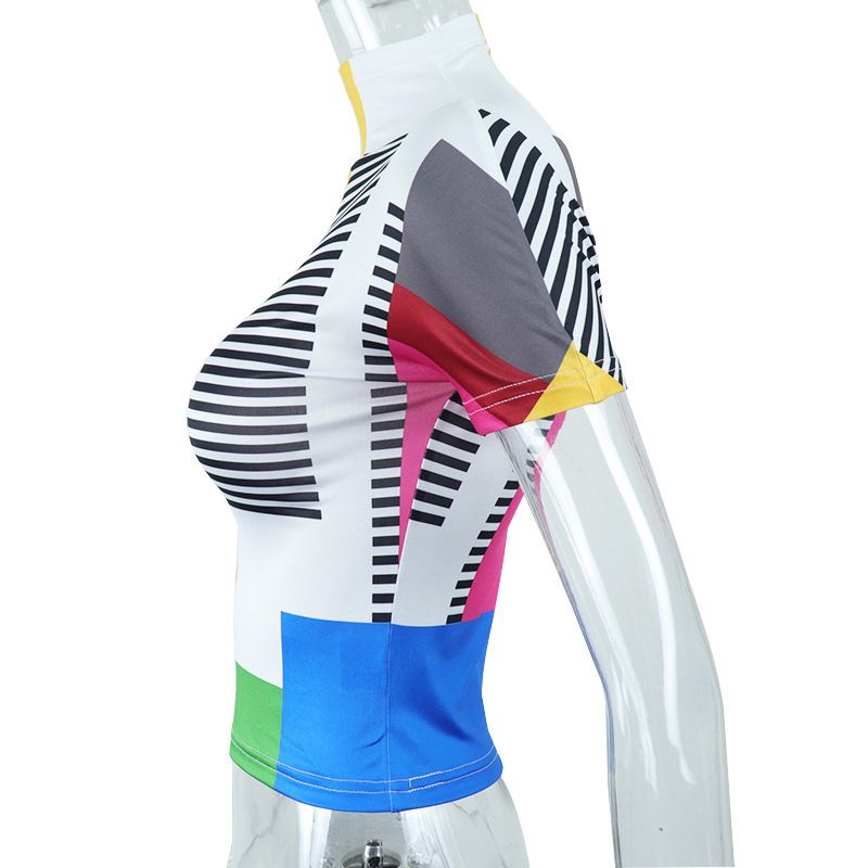 Buy Colorblock Patchwork Print Women High Neck Short Sleeve T Shirt in Nigeria