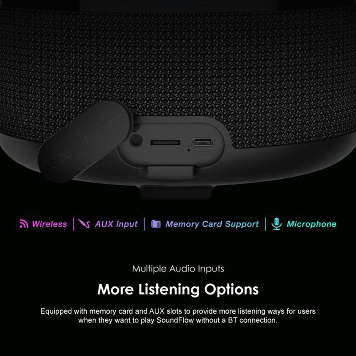 Equipped with memory card and AUX slots to provide more listening ways for users when they want to play SoundFlow without a BT connection.