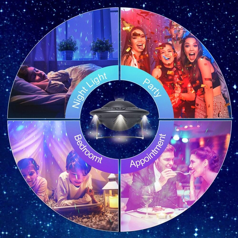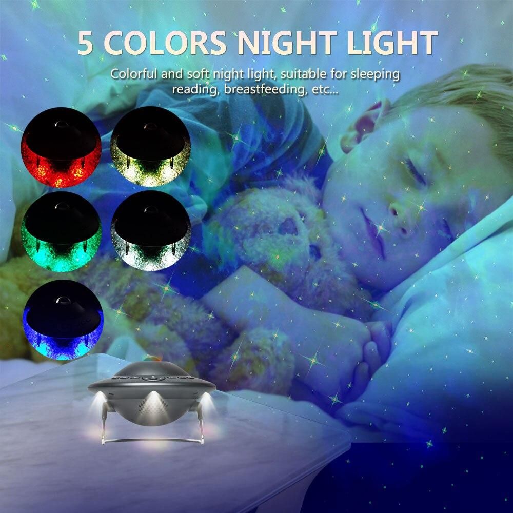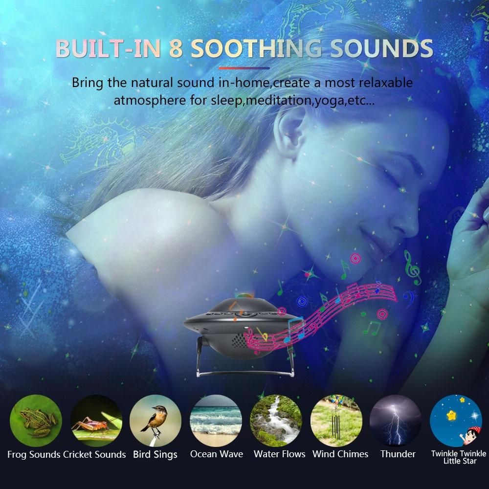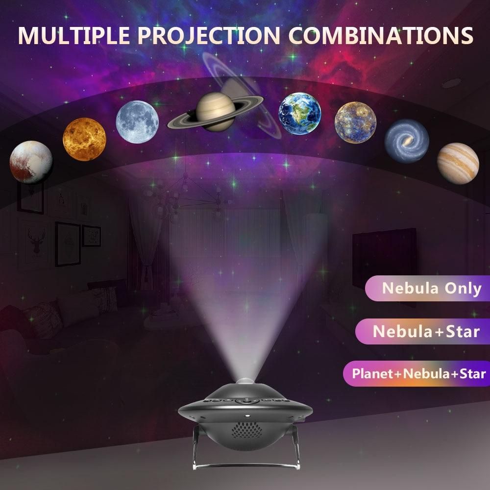 This is a very interesting electronic entertainment product, which can project stars, colored clouds and various planets (8 kinds of planets, manual switching) on the ceiling to provide you with a visual feast. The product can be connected to Bluetooth to play music, and it can also play built-in sleep aid music. At the same time, the product also has the kinetic energy of a small night light. When the device is turned on, Bluetooth will automatically turn on with a prompt tone (Bluetooth name: SKD-P1). If Bluetooth is not connected within 2 minutes, Bluetooth will automatically turn off. The product has 8 built-in sleep aid sounds, which you can control via the remote control or the buttons on the body.