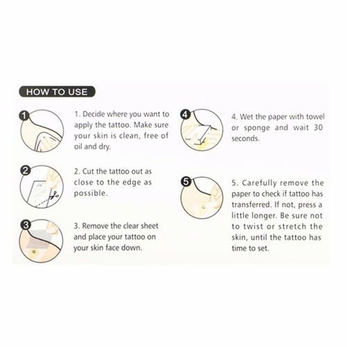 How to apply: Make sure your skin is clean and dry, then cut out the tattoo pattern required, remove the clear sheet, place face down on your skin and hold a wet cloth against it for about 30 seconds. Peel the paper aside then pat gently with the wet cloth and leave to dry. Do not twist or stretch skin until the tattoo has had time to set, which is about 20 minutes.