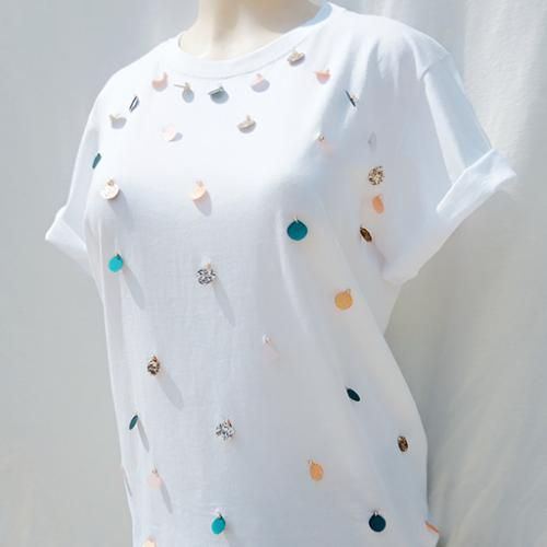 White tee,round neck, Short sleeves, colouful sequins embellished with crystals beads. Simple, classy and unique and a fit for a young lady. Available in black and white. This tee is suitable for casual and outings.
