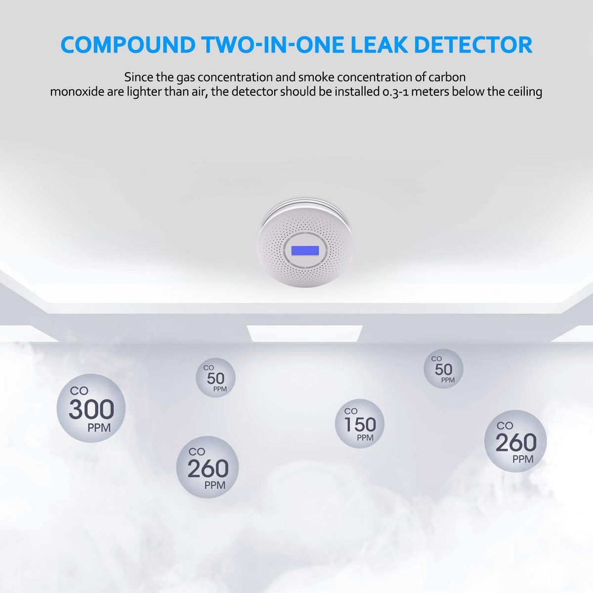 2. Because the gas concentration of carbon monoxide and smoke concentration is than air, the detector should be installed at 0.3-1 meters below the ceiling.