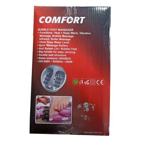 COMFORT salon style pedicure in your homeBubble Foot MassagerFunctions: Heat + keep warm, Vibration Massage, Bubble massage, Infrared, Roller massage,15cm deep water level6pcs massage rollerAnti splash lid. rubber feetBig handle for easy carryingDouble wall structure 220-240V. 50Hz. 450Wsoothing soaksjust relax and step inCOMFORT Infrared Heat Foot Spa; Compact, lightweight foot spa. Three settings for a varied operation; Infrared heat provides soothing comfort to revive tired feet; pressure rollers provide a soothing massage; Multiple settings for both heat and massage. Benefits : Compact, lightweight foot spa Three settings for a varied operation Infrared heat provides soothing comfort to revive tired feet pressure rollers provide a soothing massage Multiple settings for both heat and massage