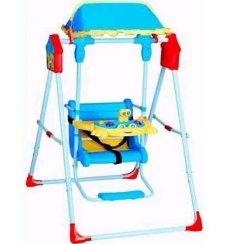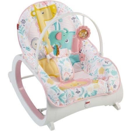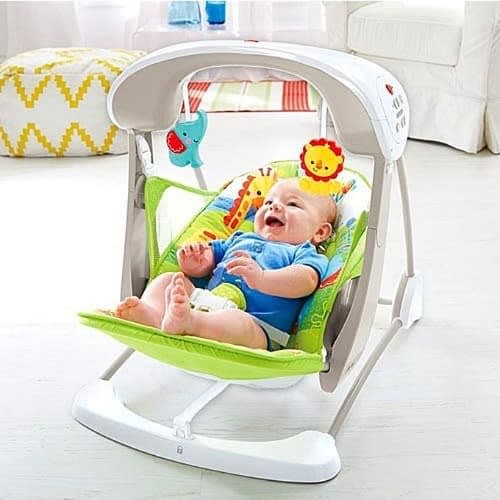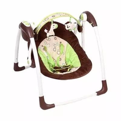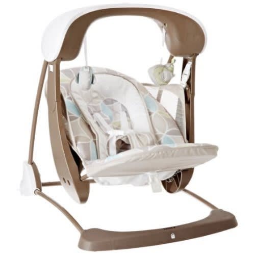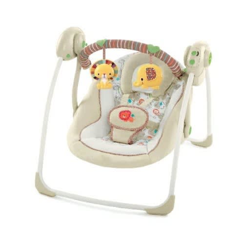 omfort, the comfort and harmony portable swing travels with baby anywhere. Designed in soft beiges and playful elepaloo styling, this portable swing is ideal for soothing a baby boy or girl. Whether entertaining baby at home or visiting with family, this portable swing calms baby with a gentle swinging motion. The quality fabrics and trims include plush faux suede, printed brushed poly, soft boa, piping, and intricate embroidery on the T-straps so baby swings in style. With a padded harness for protection, baby lounges snug and safe. Choices of two seat positions and six variable speeds accommodate baby as he or she grows. Add six melodies and baby will be swinging in true elepaloo style. Two plush toys attached to the pivoting toy bar encourage baby to engage in play. With the timer set to swing in intervals of 15, 30, or 45 minutes and whisper quiet operation, baby enjoys soothing relaxation. The machine-washable seat pad and head support make cleanup easy. Additional features include non-slip-Feet , volume control, and auto shutoff. Requires 4 c batteries, not included.