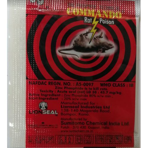 This Commando rodenticide is a fast and effective means of getting rid of small and big rats around your home as it kills and dries them instantlyCommando is a very effective rat poison and it contain ZINC Phosphide which kill rats instantly.