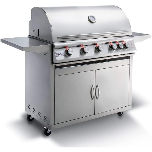 40-inch freestanding propane gas grill with 304 stainless steel constructionFeatures (5) cast stainless steel burners providing 14,000 BTU each and a rear infrared burner rated for 10,000 BTUFlame ignition and stabilizers for reliable starting and even cooking surface without flare-upsOverall size of 56.75 x 63.37 x 25.75 inches and a total of 70,000 BTUIncludes heat zone separators for distinct grilling zones and interior grill lights for illuminationHeavy-duty stainless steel grill cabinet with two doors, two side shelves, and four locking casters for mobility