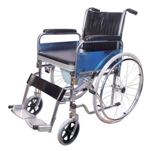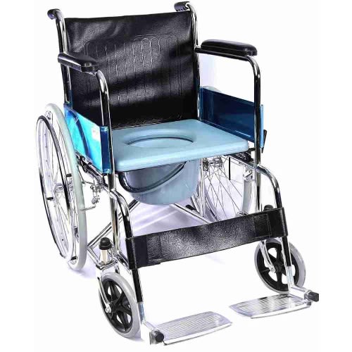 Standard Commode Wheelchair is a simple type of wheelchair with commode that can give you the independence on your mobility & other daily routines. The wheelchair has a self-contained & removable & plastic commode pail, or you can position the chair over a toilet. The chair comes with durable steel frame with powder coated finish. The chair comes with flip down armrests & detachable footrests. The padded upholstery is made of PU that is durable and comfortable. User propelling wheelchair with integral commode. Comprises stainless steel frame; front castors; rear wheels with lever brakes; rear tipping levers; individual swing away, detachable footplates; seat cushion with front cutaway; front loading commode pan; padded armrests and individual push handles.Commode chairs are designed for demand crowd who cannot feasibly get to the toilet every time. Bedside commode chairs are ideal for those who are confined to a bed during the day, or for nigh-time use with individuals who are more mobile.Medical commode chairs have a few different features that make toileting easier. For example, you can choose a bedside commode with Protection bar to make transferring into and out of the commode easier. You can choose a medical commode chair that folds flat to save space in a bedroom or facility. Commode chairs are also convenient for travel. We also offer commode accessories, such as Commode Liners and buckets. See our entire selection of commode chairs below!Features of our User propelling Standard Commode Wheelchair & raquo; Durable steel frame with powder coated finish & raquo; Removable seat panel & raquo; Removable plastic commode pail with lid & raquo; 5 & Prime; PVC front casters & raquo; 24 & rdquo; rear wheels with solid tires & raquo; Padded armrests can be flipped down & raquo; Detachable & swing away footrests with PE flip up footplates & raquo; Padded PU upholstery is durable and easy to cleanOur Standard Commode Wheelchairs offer versatility, high performance and more comfortable ride for the users. These wheelchairs are durable, easy to maintain and provide enhanced function and positioning. They are fully customizable with various options which allow toileting, built-in or removable arm rests, swing-away footrests, two large wheels, two small wheels in the front and push handles to allow non-occupants to propel the chair.This standard Commode Wheelchair is ideal for physically handicapped people. It provides optimal comfort while sitting, lightweight and easy to carry. It is made from superior quality material for enhanced durability. It is a revolutionary support that helps patients in rehabilitation of various sufferings due to musculoskeletal disorders. Make a point of getting this Wheel Chair for easy movement.