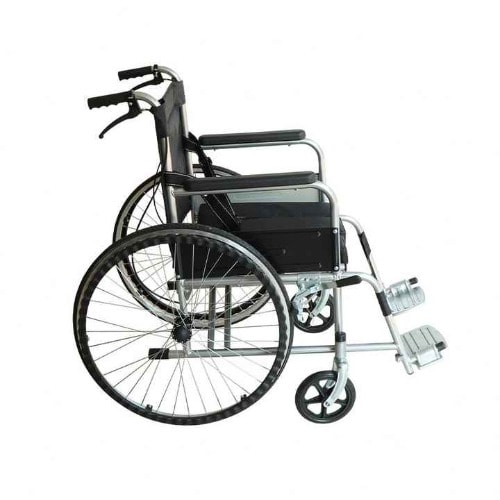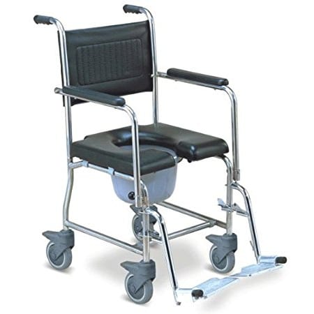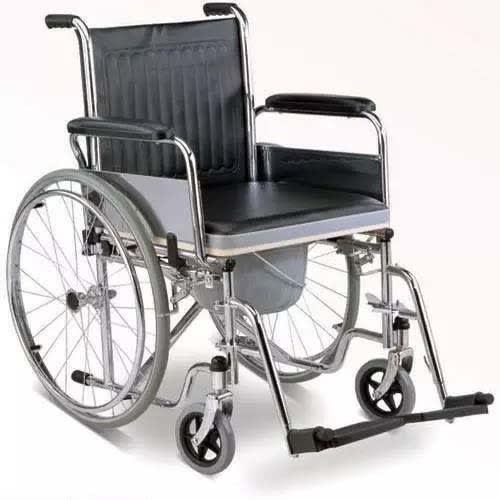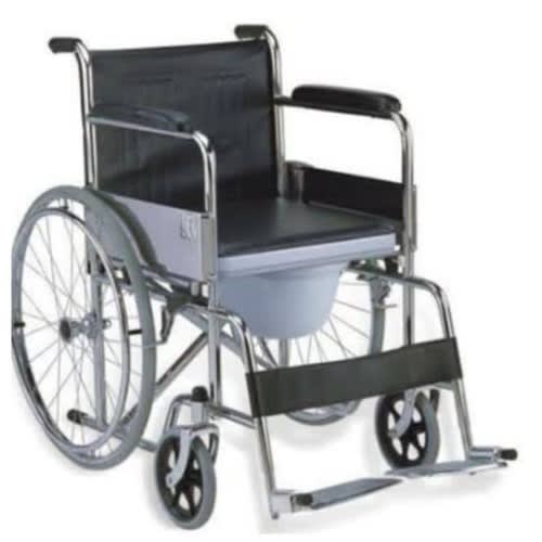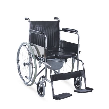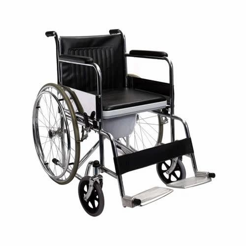 Standard Commode Wheelchair is a simple type of wheelchair with commode that can give you the independence on your mobility & other daily routines. The wheelchair has a self-contained & removable & plastic commode pail, or you can position the chair over a toilet. The chair comes with durable steel frame with powder coated finish. The chair comes with flip down armrests & detachable footrests. The padded upholstery is made of PU that is durable and comfortable. User propelling wheelchair with integral commode. Comprises stainless steel frame; front castors; rear wheels with lever brakes; rear tipping levers; individual swing away, detachable footplates; seat cushion with front cutaway; front loading commode pan; padded armrests and individual push handles.Commode chairs are designed for demand crowd who cannot feasibly get to the toilet every time. Bedside commode chairs are ideal for those who are confined to a bed during the day, or for nigh-time use with individuals who are more mobile.Medical commode chairs have a few different features that make toileting easier. For example, you can choose a bedside commode with Protection bar to make transferring into and out of the commode easier. You can choose a medical commode chair that folds flat to save space in a bedroom or facility. Commode chairs are also convenient for travel. We also offer commode accessories, such as Commode Liners and buckets. See our entire selection of commode chairs below!Features of our User propelling Standard Commode Wheelchair & raquo; Durable steel frame with powder coated finish & raquo; Removable seat panel & raquo; Removable plastic commode pail with lid & raquo; 5 & Prime; PVC front casters & raquo; 24 & rdquo; rear wheels with solid tires & raquo; Padded armrests can be flipped down & raquo; Detachable & swing away footrests with PE flip up footplates & raquo; Padded PU upholstery is durable and easy to cleanOur Standard Commode Wheelchairs offer versatility, high performance and more comfortable ride for the users. These wheelchairs are durable, easy to maintain and provide enhanced function and positioning. They are fully customizable with various options which allow toileting, built-in or removable arm rests, swing-away footrests, two large wheels, two small wheels in the front and push handles to allow non-occupants to propel the chair.This standard Commode Wheelchair is ideal for physically handicapped people. It provides optimal comfort while sitting, lightweight and easy to carry. It is made from superior quality material for enhanced durability. It is a revolutionary support that helps patients in rehabilitation of various sufferings due to musculoskeletal disorders. Make a point of getting this Wheel Chair for easy movement.