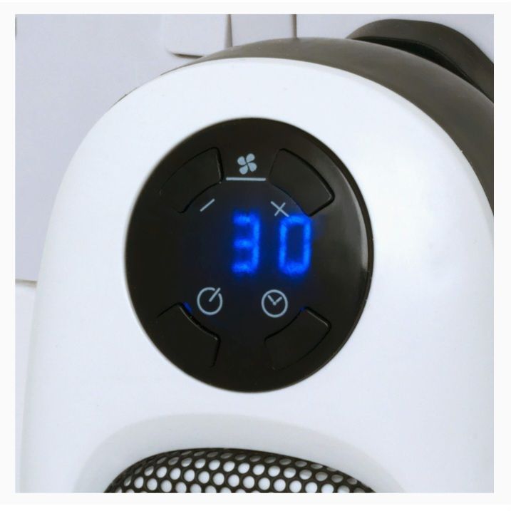 - Measuring approximately 10 x 7.5 x 19 cm, this compact heater fits easily into the power outlet and exudes heat up to 30°C.