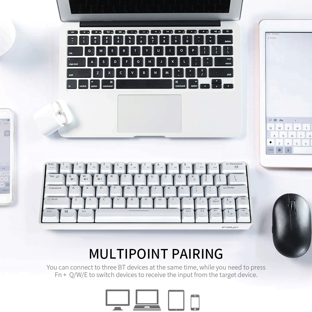Multiponit pairing. You can connect to three BT devices at the same time, while you need to press Fn + Q/W/E to switch devices to receive the input form the target device.