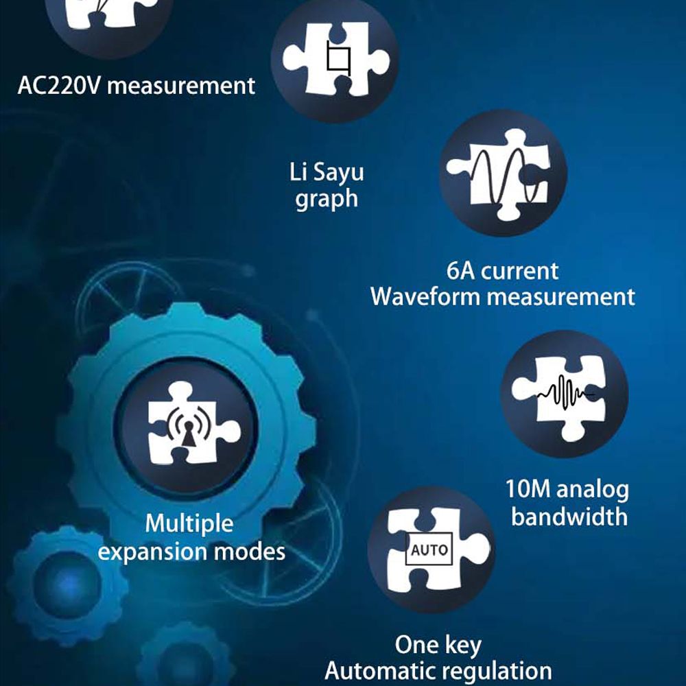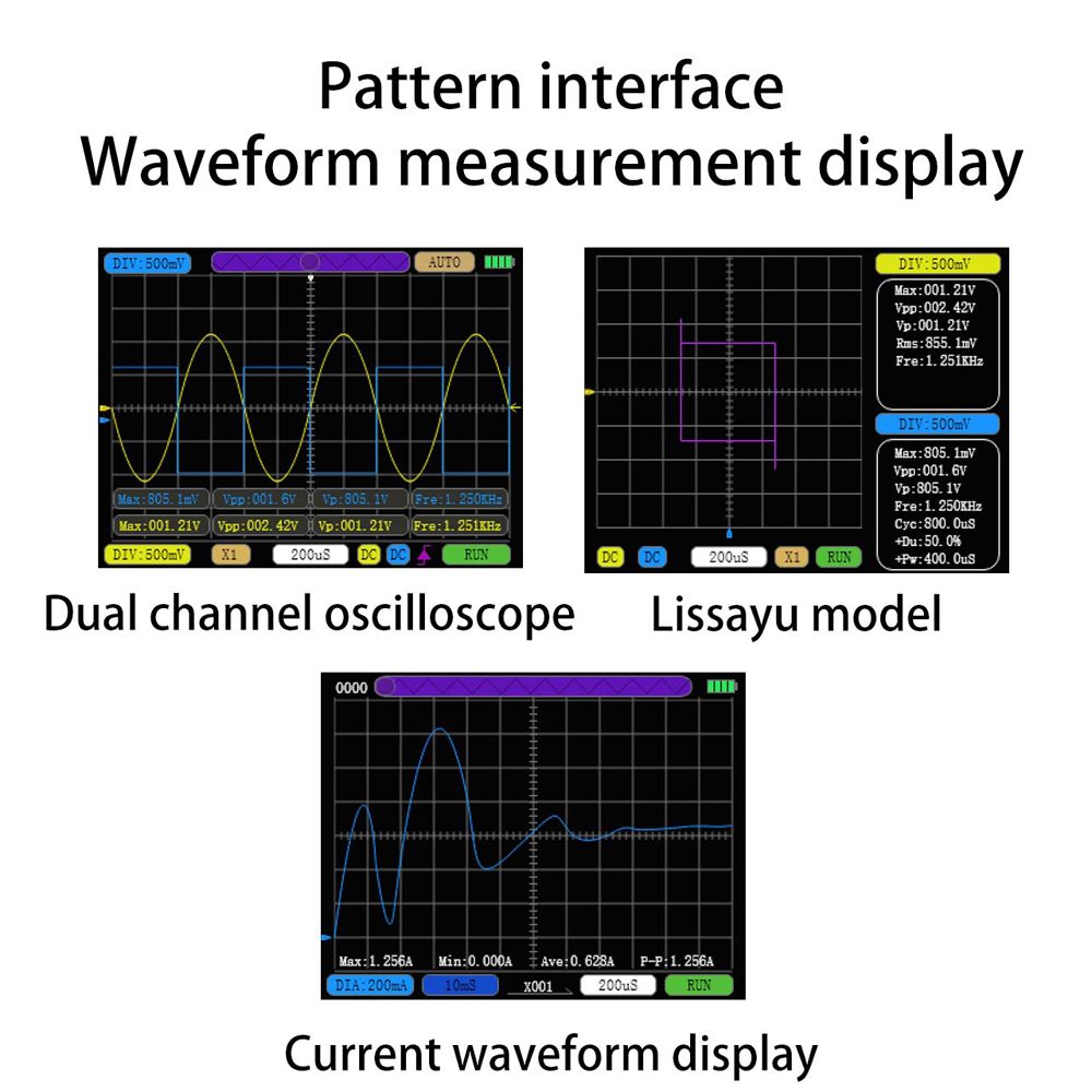 Dual channel oscilloscope with 50M sampling rate, 2MHz actual bandwidth, and 10MHz analog bandwidth. With complete trigger functions (single, normal, automatic), both periodic analog signals and non-periodic digital signals can be freely used. Waveform measurement display function, 3.2-inch LCD display, 320 * 240 resolution, three display modes design, you can easily adjust to dual-channel oscilloscope mode, XY model, and current waveform display. 6A current waveform measurement, 20K storage depth, support waveform compression expansion. With multiple expansion functions, and support firmware upgrades.