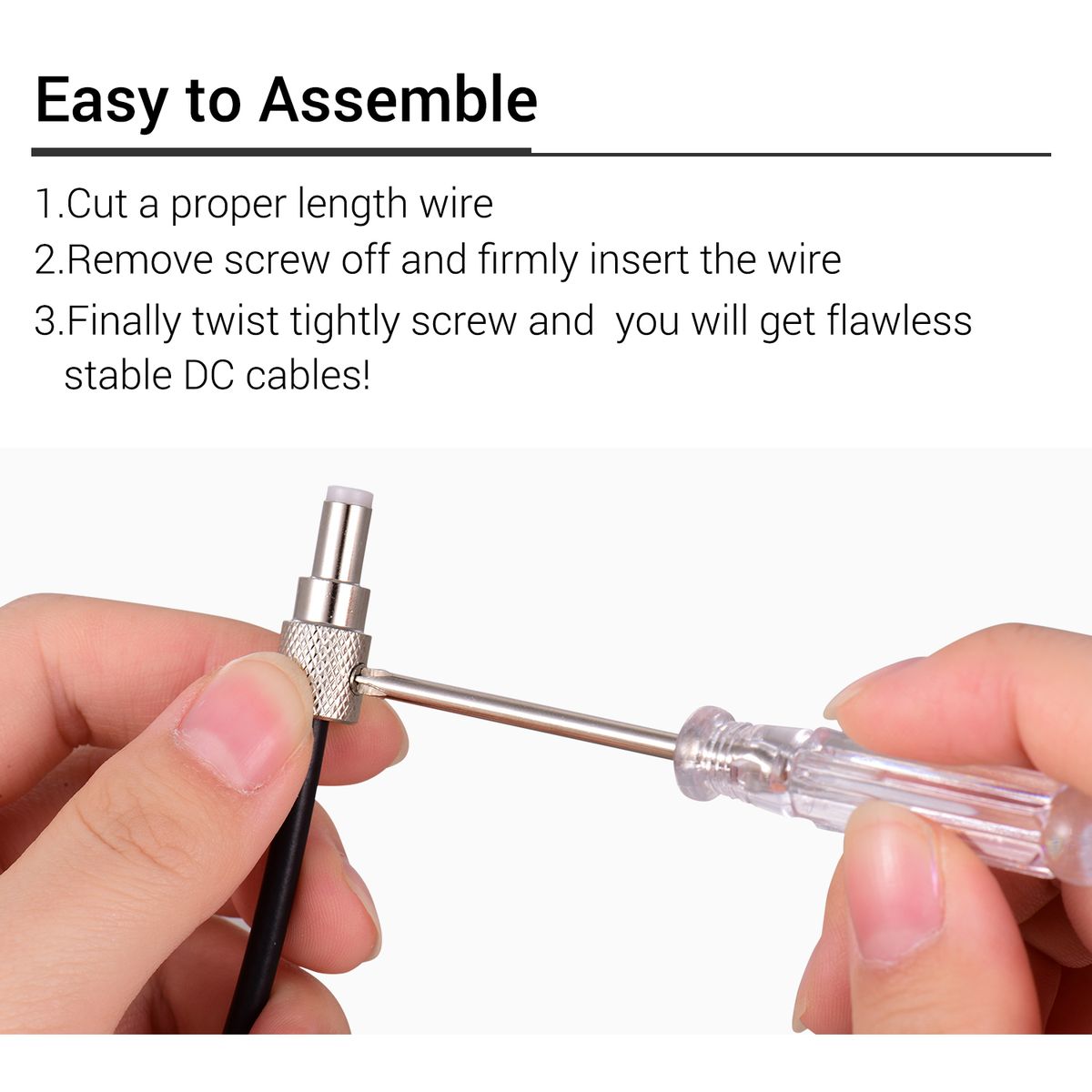 As simple as to cut a proper length wire, then insert the wire end into the plug, finally twist tightly screw and you will get flawless stable DC cables.