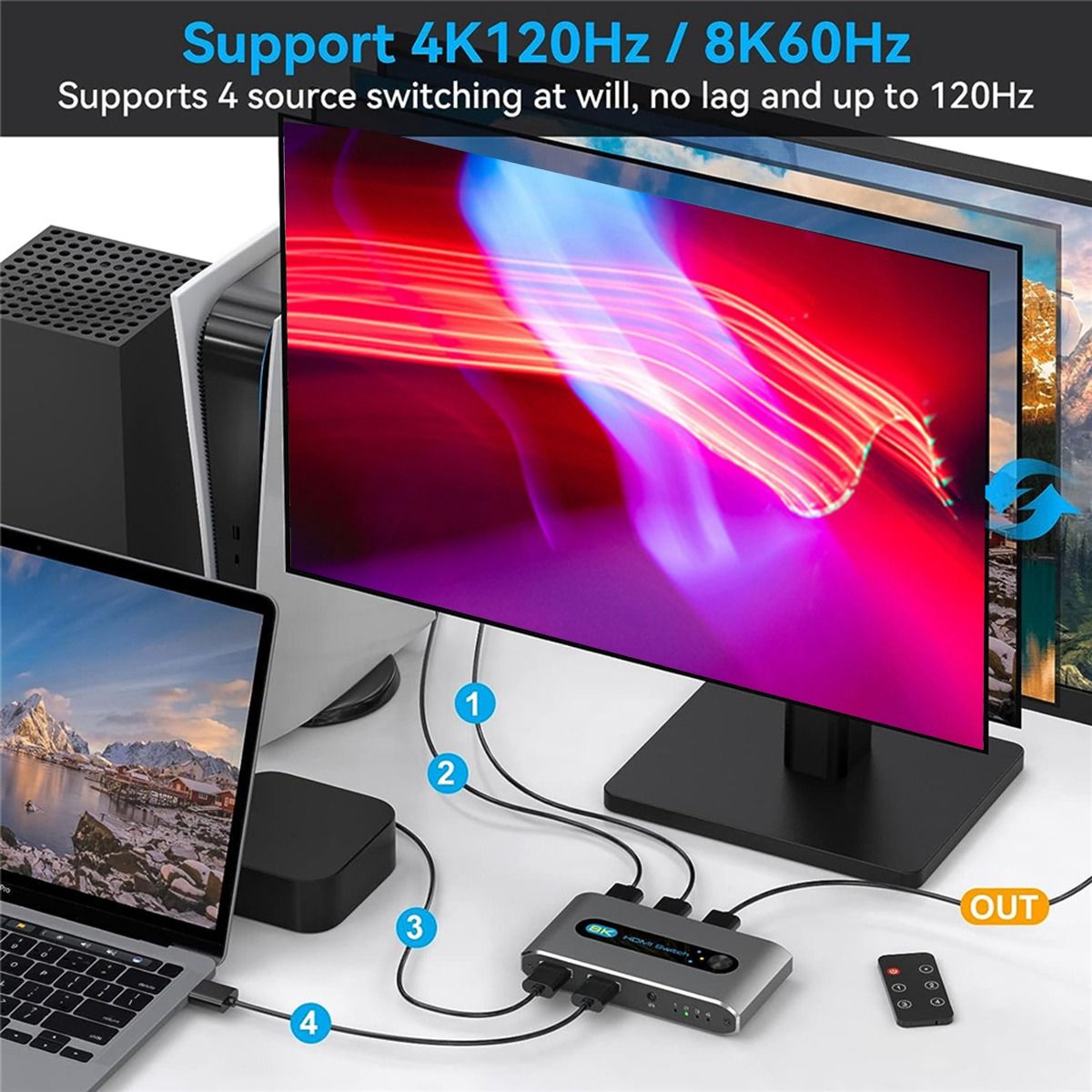 [ Switch 4 In 1 Out]The Switch 4 port allow to devices to1 monitor or projector.Just simply use the 8k 2.1 switcher panel button or IR remote control or external control to swap signals without plug and unplug the cables.(Note:Transmit 8K video please use the Ultra high speed cable and please power the switch Selector when use)