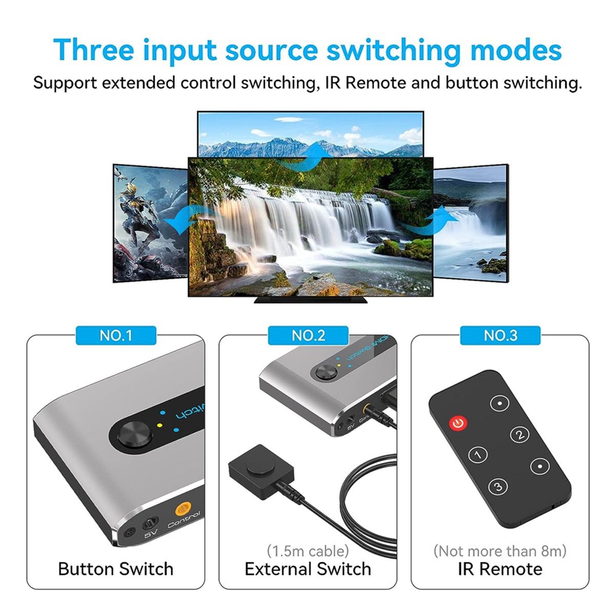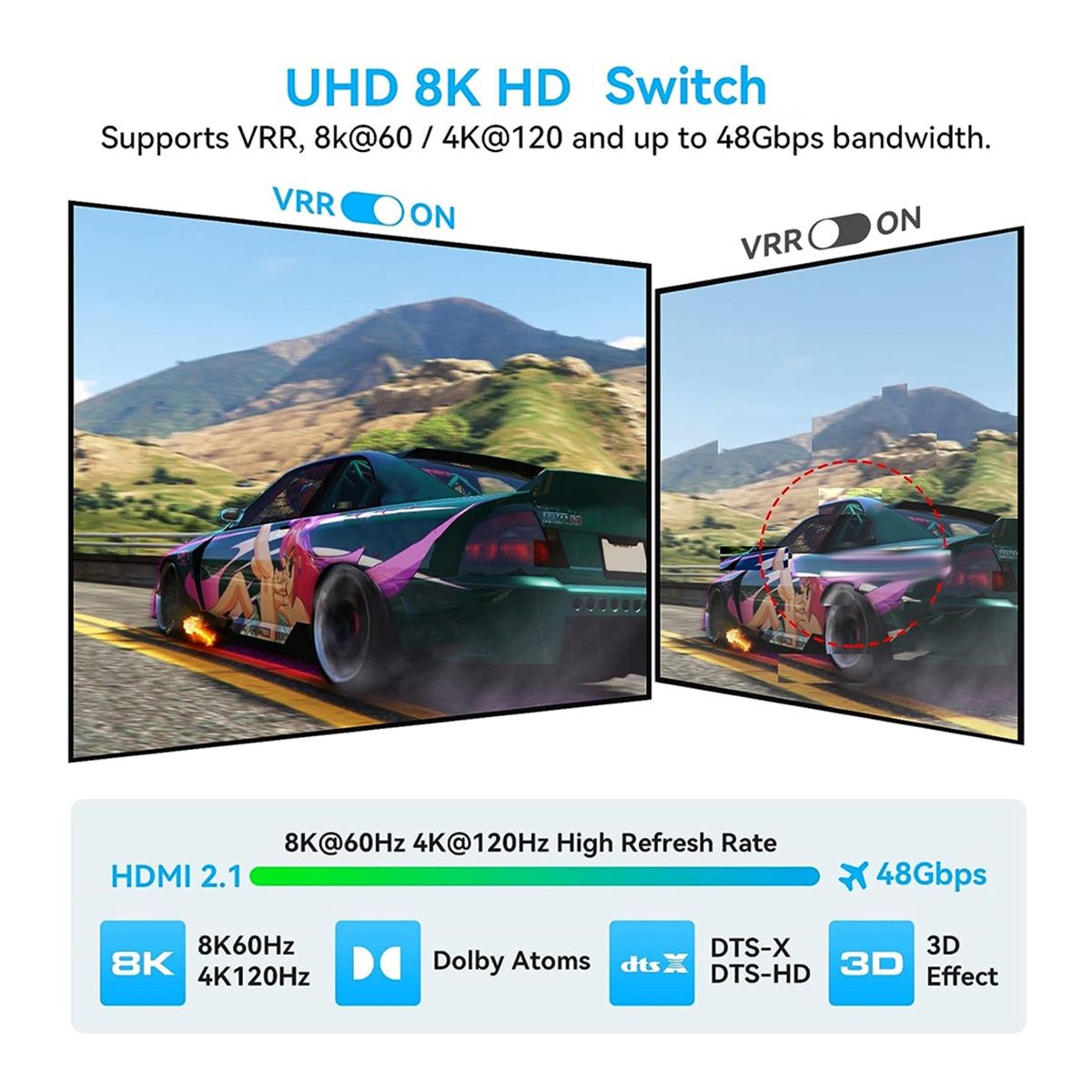 [UHD 8K Switch] Switch Selector support Ultra HD 8K@60Hz/4K@120Hz/3D/1080P and back forward compatible,Support HDCP 2.3, LPCM7.1,DTS-HD,-trueHD,DTS-X, Atoms.Smooth picture switching, no delay, no distortion!Providing you a visual feast and amazing gaming experience.