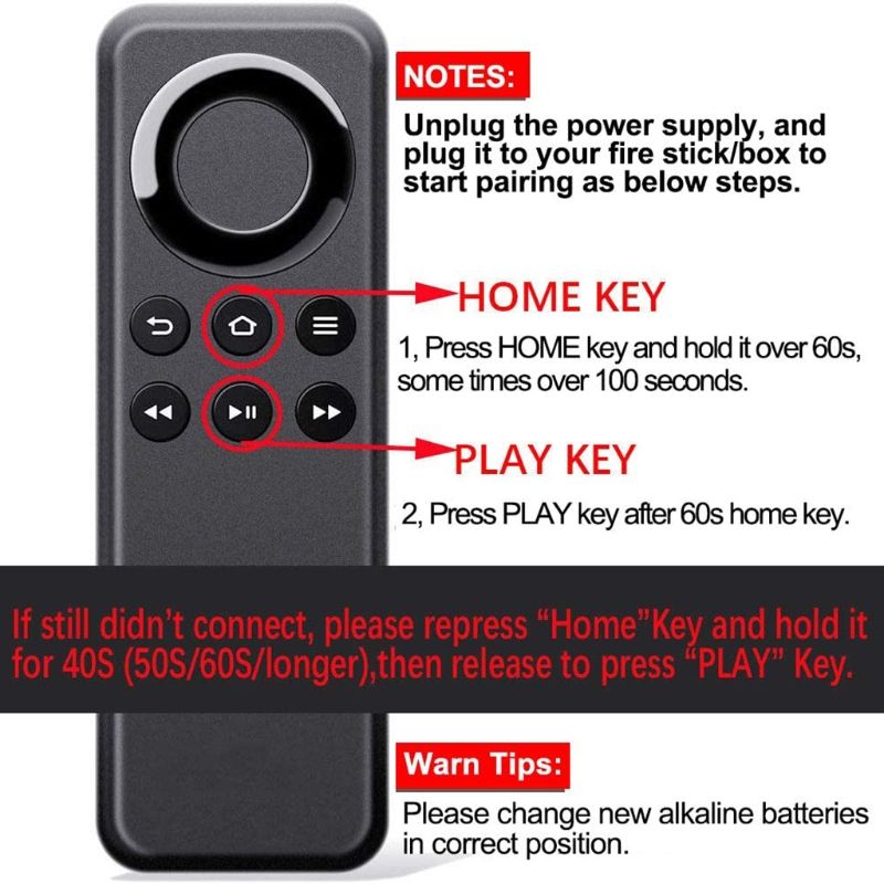H7JF Replacement Remote Control CV98LM Compatible with Ama-zon Fire TV Stick and Fire TV Box Features: 1 . This remote does not have MIC, do not support Voice Operated. 2 . The Remote Control Can Work with Below Knowing Models: Ama-zon Fire TV Stick and Fire TV Box , The 1st Generation: W87CUN CL1130, The 2nd Generation: DV83YW PE59CV. 3 . Quickly skip to your favorite scenes with standard navigation and playback controls 4 . Control your Fire TV Stick from anywhere in the room using Bluetooth-compatible 5 . Compatible with : Ama-zon Fire TV Stick and Fire TV Box Specification: How to Pair this remote to your Fire TV Stick/Box: 1) Unplug power supply of your Fire TV Stick/ Fire TV Box, then plug it back in. 2) Hold down the Home on (The on that looks like a house/arrow symbol) for up to 60 seconds or more, you may have to try it several times.Then it will be paired with your device. 3) If it is failed, you may have to unplug the Fire TV Stick/Fire TV Box several times to pair it, but it should work fine, all remotes have been tested before shipped out. 4) If for some reason you can't get it work after many tries, please feel free to contact us. Package Includes: 1 * CV98LM Remote Control note: 1.Due to the light and resolutions setting difference, the item's color may be slightly different from the pictures. 2.Please allow slight dimension difference due to different manual measurement.