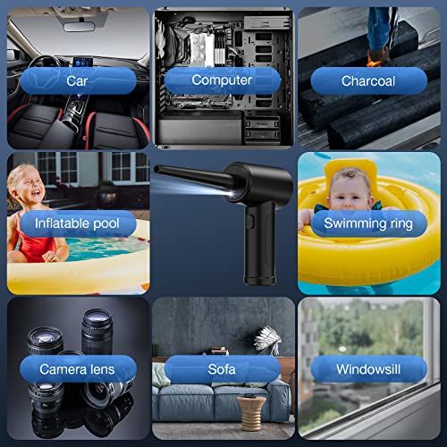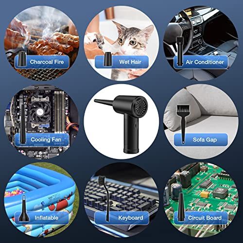 - 5 nozzles+2 brushes: The eletri air duster ome with 5 nozzles and 2 brushes; Suitable for dust removal of omputer ases, keyboards, ars, fans, lily windows, et.Use the brushs for better leaning. The multifuntional nozzle is used to inflate swimming rings, yoga balls, air mattresses, et.
