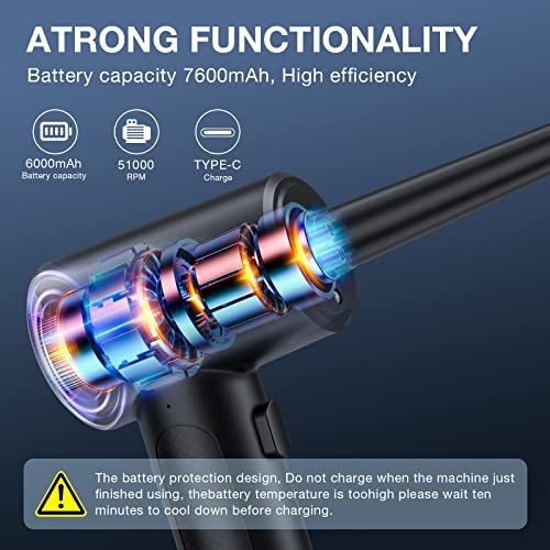Details: The portable air duster will help you easily lean orners or plae where hand annot reah. you an use it in a variety of senarios: Keyboards, omputer ase, ar seats, or even your le go toys. Great to help you deep leaning printed iruit boards, omputers, Camera, eletroni produts, traditional wipers or Instruments and medial equipment.Replaes Air CansCordless air duster adopts physial dust removal design, does not ontain any hemial agent, will not ause any harm to your body, is safer and more environmentally friendly. Re-use after harging, more omfortable/ost-effetive than onstantly buying anned airHow to use-Long press the button for 3 seonds to turn the eletri duster on or off.-Short press the button to swith the wind speed.-Red light means harging, green light indiates fully harged.NotiePlease do not use the air duster when harging.Compressed air dusters battery protetion design, Do not harge when the mahine just finished using, the battery temperature is too high, please wait ten minutes to ool down before harging.Pakage Inluded1* Air DusterBrush Nozzle*1Short Nozzle*1Large Nozzle*1Long Nozzle*1Compressed Air Nozzle*1Brushes*2Type C Charging Cable*1Manual*1