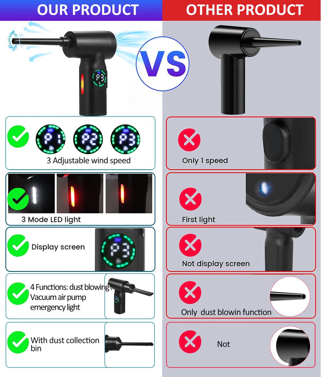 【FUNCTIONAL DIVERERSIFICATION 】It is not only a compressed air duster,and a mini vacuum for homes or cars,but also be used for inflating rubber boats, yoga balls, basketballs, tires, inflatable beds etc. and also be used as an emergency light that is compact, lightweight and easy to use. You can freely switch to air inflation or compressed air duster or vacuum according to your needs, easily removes dirt, debris, dust, pet hair, and deeply embedded dirt. Cleaning will become a enjoy. In an emergency, it can also be used as an emergency light.