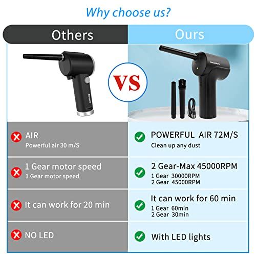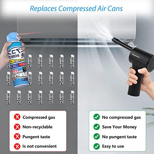 - Save-Money & Eo-FriendlyCompared with ompressed air blower ans, our portable air blower for omputer does not produe hemials, s or residues during the leaning proess. Our keyboard air blower protets your eletronis from s. We have improved the produt battery so that air ompressor allows more than 00 uses, whih an save you a lot of money, In the long run, It an save you money and protet the environment.