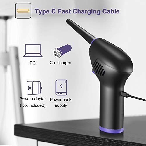 - Reliable & Fast ChargingRehargeable air duster built-in large apaity 100mAh lithium batteries allow blower to run a long time ontinuously. It has 2 speed settings, low speed an runs about minutes, high speed an runs 40 minutes. The rehargeable air duster designed with a 10W TYPE-C harging port makes it more easily to harge. You an use the TYPE-C ord of your phone or tablet with a 5V2A adapter(not inluded)to harge.