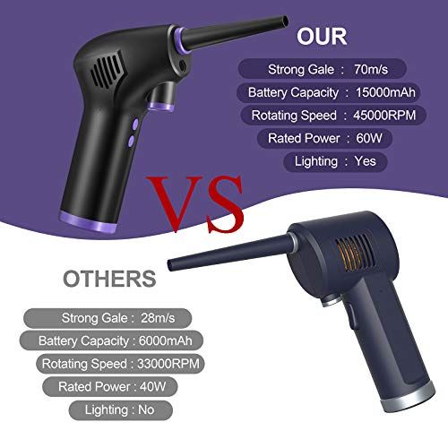 - Upgraded & PowerfulOur dust blower produe a powerful thrust of air at m/s, it tops the market, other brands air duster is 28m/s. Our air duster rotating speed an reahes to 400RPM, ontinuously provide high-pressure air to guarantee a deep leaning. Others eletri duster is only 33000RPM. air duster is your best leaning helper in home, offie and your ar.