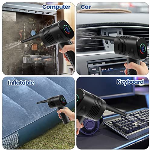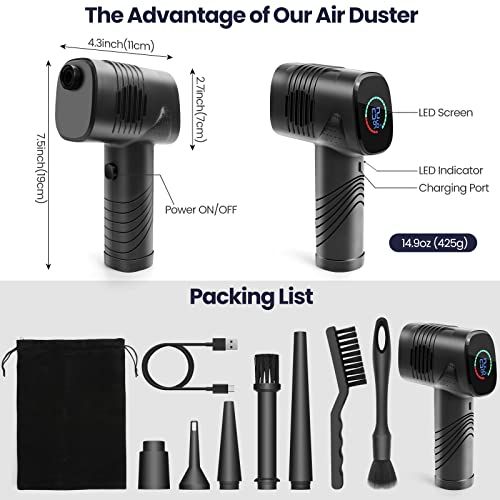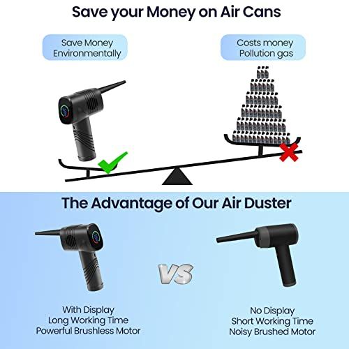 - Powerful Dust CleanerInstead of anned air duster and equipped with a Brushless 38,000 RPM motor, that make sure it more quieter and last longer than ompetitors. Dust an be easily blown away with lower energy onsumption and maintaining strong power, for deep leaning of tiny dust from omputers, air onditioners, keyboards, sofas, ars, ameras and medial equipment et.
