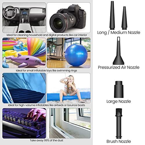 - 9 Ps Aessories for Widely Used The ordless air duster is easy to arry when going out, easy to hold and arry. It omes with 9 ps super omplete aessories, inludes 5 different detahable Nozzles, 2 Brushes, 1 Storage Pouh,1 USB C Cable. It is ideal for deep leaning of the home, offie, ar interiors, windows, pet hair, toys and other eletroni equipment, et. with inlude 2ps nozzles for inflating swim rings and air beds.