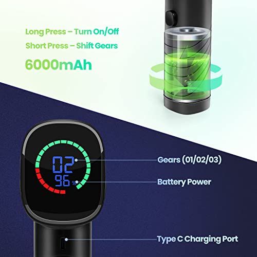 - LCD Sreen & 3 Gear SpeedsThe ompressed air duster omes with an LED sreen, it always show you power and gears status. It shows the remaining power and 3 gear speed. Long press the power button to turn On & Off air duster, Short press the button to adjust the speed gear. When the LCD display red light, it means battery low and needs to be harged.