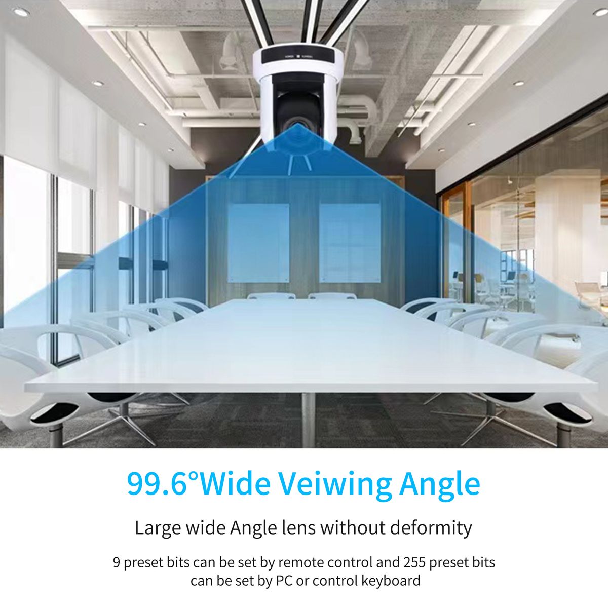 ➤ The camera horizontal rotation 355 deg;, pitching range 120 deg;, 99.6 deg; wide viewing angle, easily realised all-round scan. You can see everyone in the meeting room clearly. Available control protocols: PELCO, VISCA; Support USB port, RS-232/RS-422 port connection.