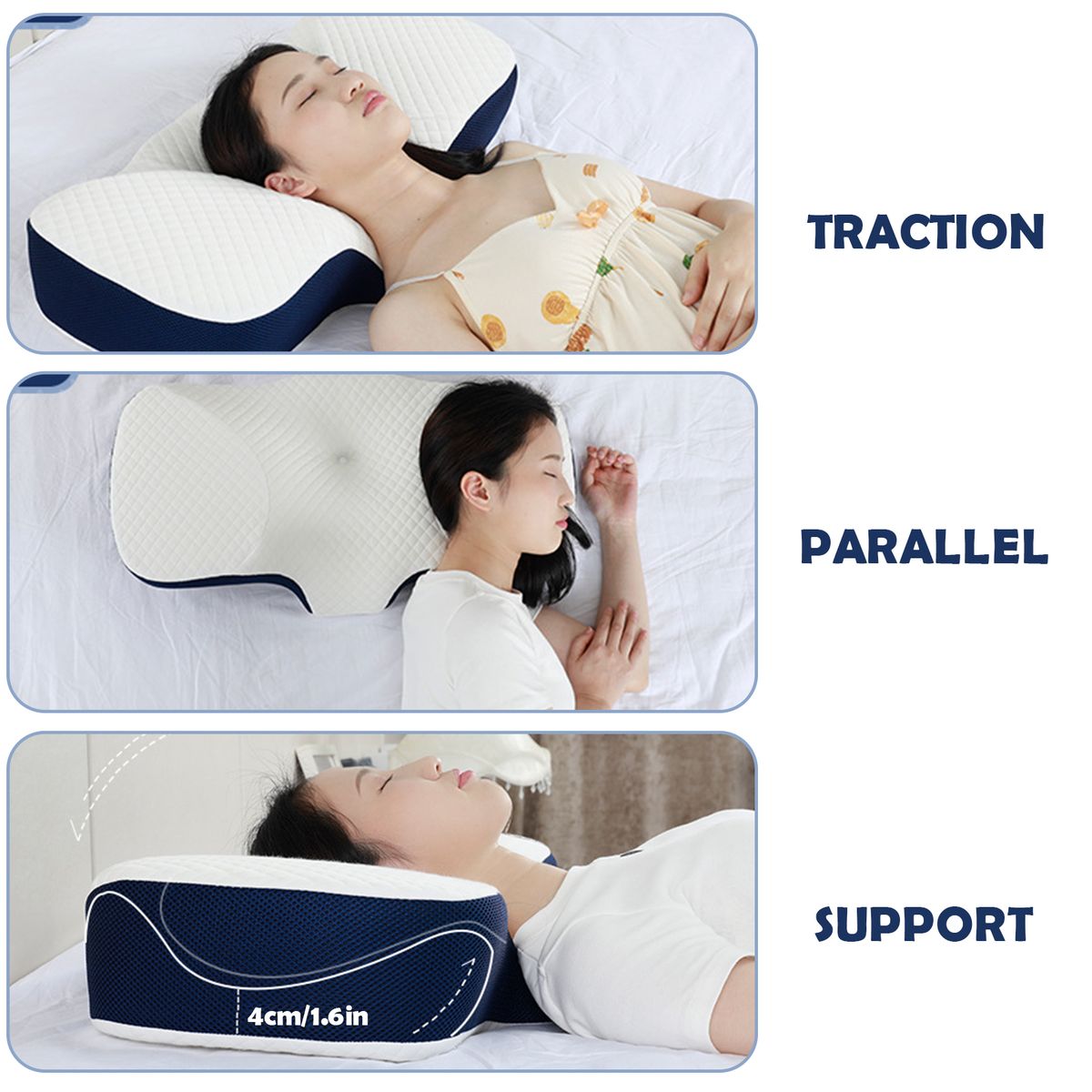 The lower part offers appropriate back traction when on the back sleep position. The curved design fits the face shape. Ventilation hole design allows more air in amp;out.