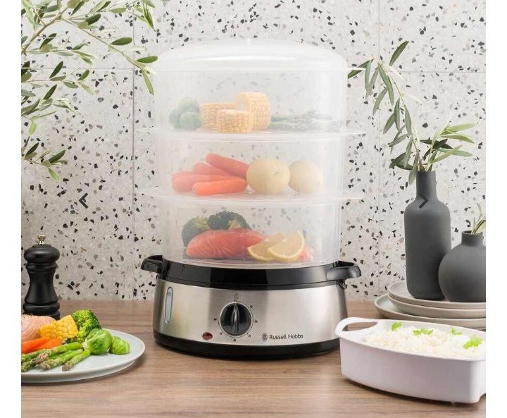 With three separate baskets and 800 Watts of steaming power, the Russell Hobbs Cook at Home Food Steamer is the smart and healthy way to steam food. Designed to retain all the nutrients and vitamins of your food, this steamer features a 9 litre capacity and three tiered design to cook rice, vegetables, fish and more all at once!