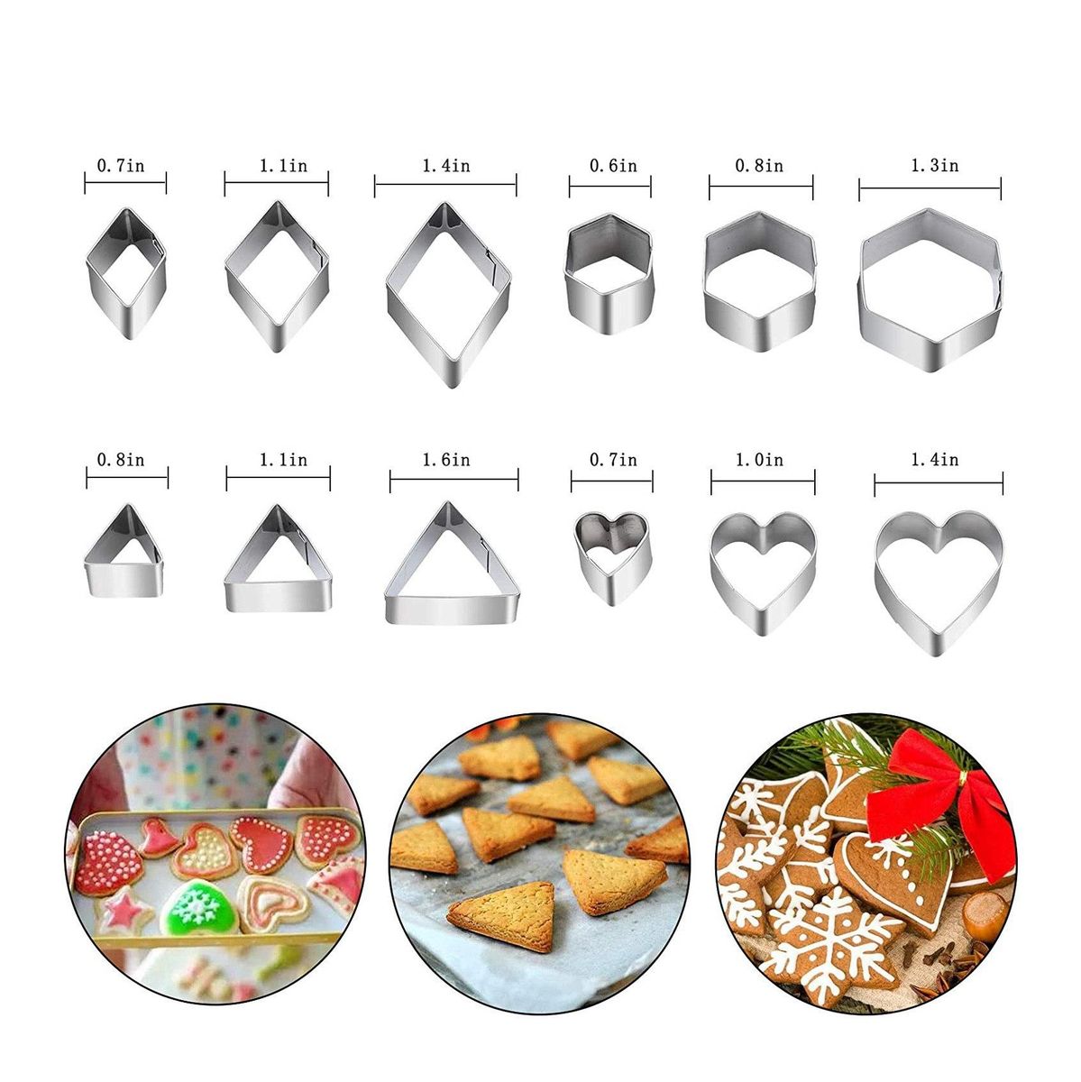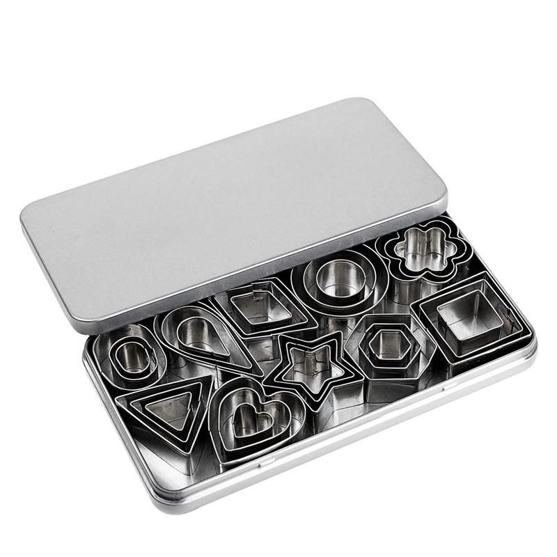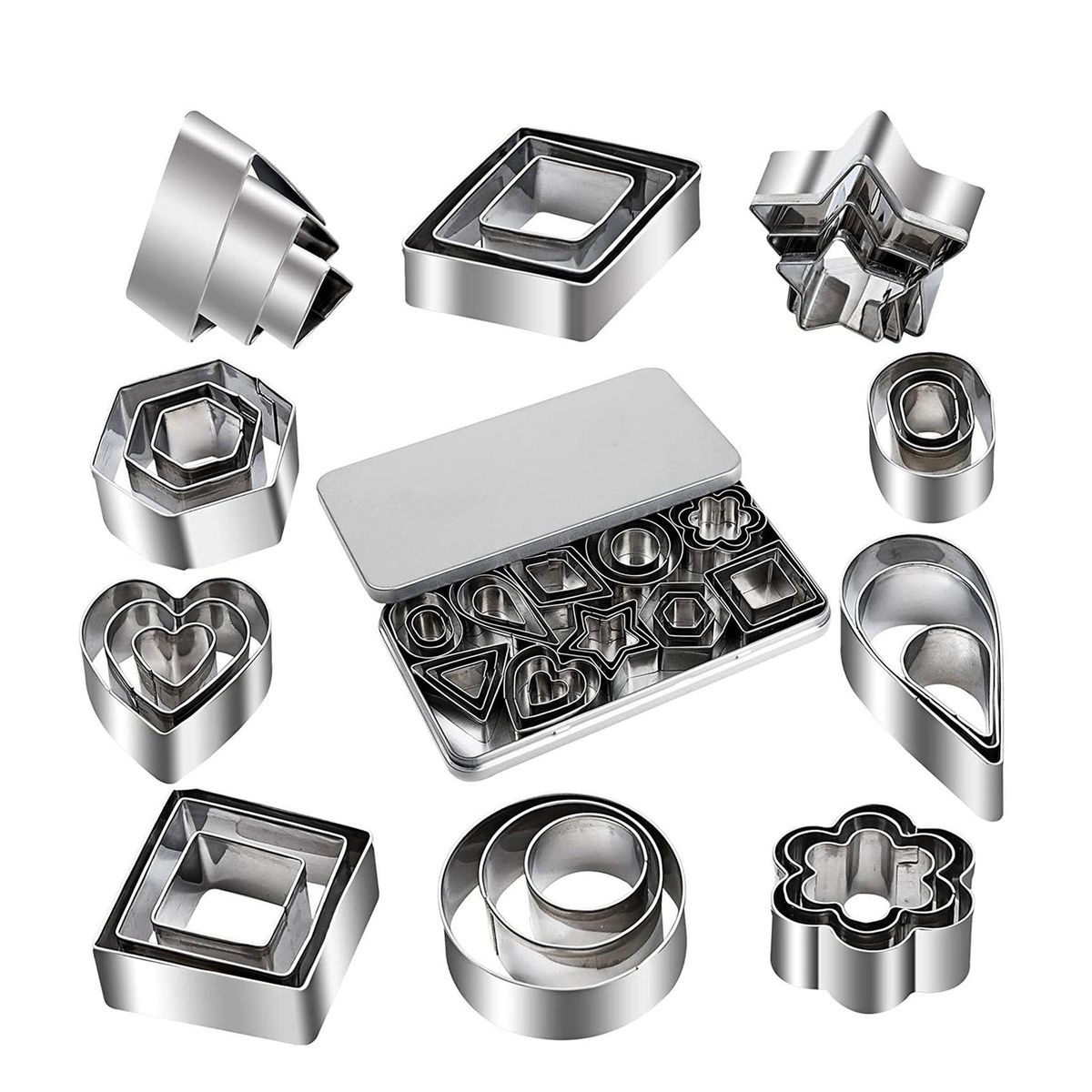 Shapes Cookie Set includes 3 sizes of 10 different shapessuch as 3pc star shape3pc flower shape3pc circle shape3pc heart shape 3pc square shape 3pc rectangle shape 3pc triangle shape 3pc oval shape
