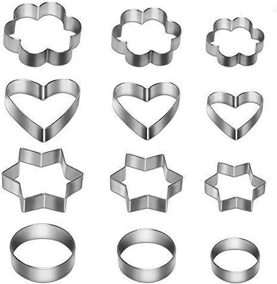 sharp dangerous seams, and a plain clean edge on the bottom to cut with ease.Biscuit Cutter Set is widely used: including cutting cookies, pastries, dough, fondant, empanadas,crumpets, tarts, canapes,doughnuts, vegetables, English muffins, bread, ravioli pasta . Use it for baking, cooking, frying eggs or making pancakes.4 designs and shapes cookie cutters: Heart, Round, Star, Flower shapes Each shape has further 3 sizes which enables you to make different size of your favorite cookie biscuits.Suitable for making cookies, or decorating patterns for other pastries, fondant cakes, sugar paste, petal paste, DIY biscuits, chocolate, fruit bouquet.The cutter set has no sharp dangerous seams, and a plain clean edge on the bottom to cut with ease.Biscuit Cutter Set is widely used: including cutting cookies, pastries, dough, fondant, empanadas,crumpets, tarts, canapes,doughnuts, vegetables, English muffins, bread, ravioli pasta . Use it for baking, cooking, frying eggs or making pancakes.4 designs and shapes cookie cutters: Heart, Round, Star, Flower shapes Each shape has further 3 sizes which enables you to make different size of your favorite cookie biscuits.Suitable for making cookies, or decorating patterns for other pastries, fondant cakes, sugar paste, petal paste, DIY biscuits, chocolate, fruit bouquet.
