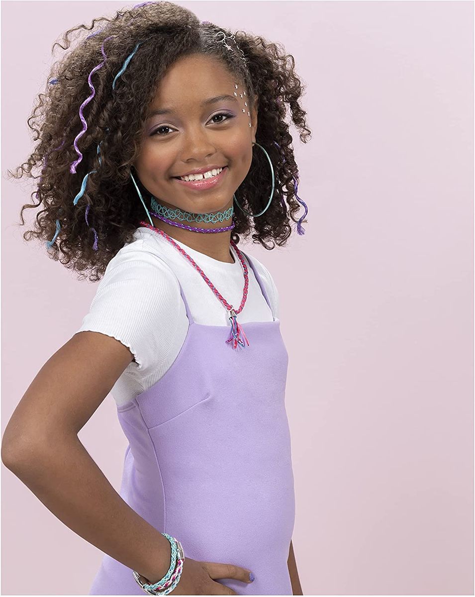 Create and style your own hair extensions with the deluxe Cool Maker Hollywood Hair Extension Maker! Only available on Amazon, this exclusive DIY arts and crafts studio comes with everything you need to customize and style hair extensions you can really wear, including 18 extensions six are bonuses. and extra hair accessories. Its so fun and easy to create girls hair extensions for kids with the Hollywood Hair Extension Maker. Choose a colored or patterned hair ribbon, design any way you want with the included markers and load the ribbon into the machine. Press the button and the motorized Hollywood Hair Extension Maker magically transforms your hair ribbon into a super cute wearable hair extension. Next, style your extension your way. With a heatless curling wand and two attachments, you can create so many camera ready styles. Fill the spray bottle with water and spray to set tight curls, loose beach waves, glamorous Hollywood curls or a sleek and straight look. For best results, allow your curls to set for two hours on the curling wand until they're dry and ready to wear. Add a hair clip and wear your trendy hair extensions, then create more styles to share with your squad! Use the headband to style a braided crown or wear your extensions swept to the side. When you're finished styling, conveniently store everything in the base of the machine. To create even more unique hairstyles like double buns, ponytails and more, look for the Hollywood Hair Party Pop and Starstruck Refills each sold separately. Customize your look from head to toe with the Cool Maker Hollywood Hair Extension Maker, 2 in 1 KumiKreator and GO GLAM Nail Salon each sold separately. Bring the salon home and create endless looks with the Amazon exclusive Cool Maker Hollywood Hair Extension Maker.