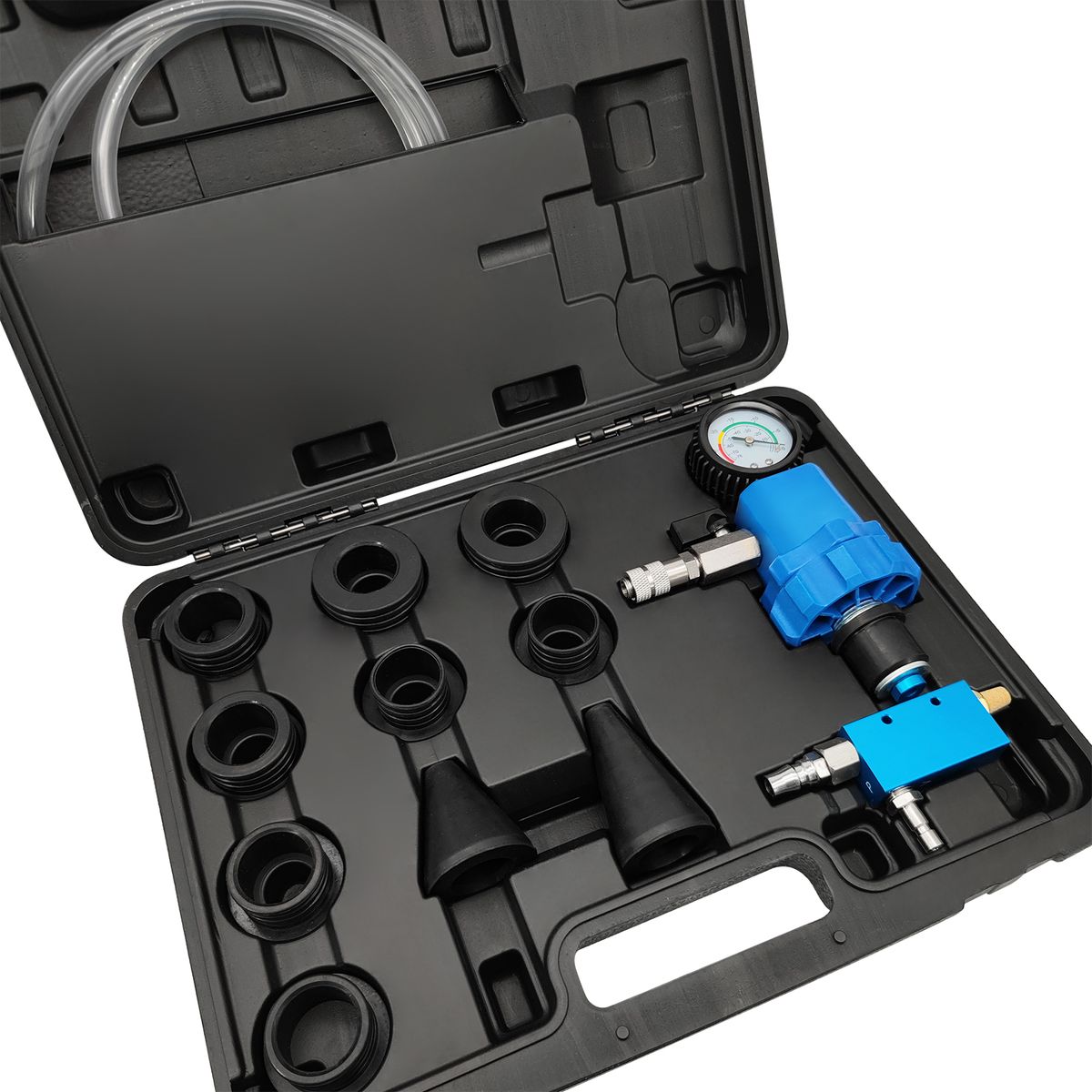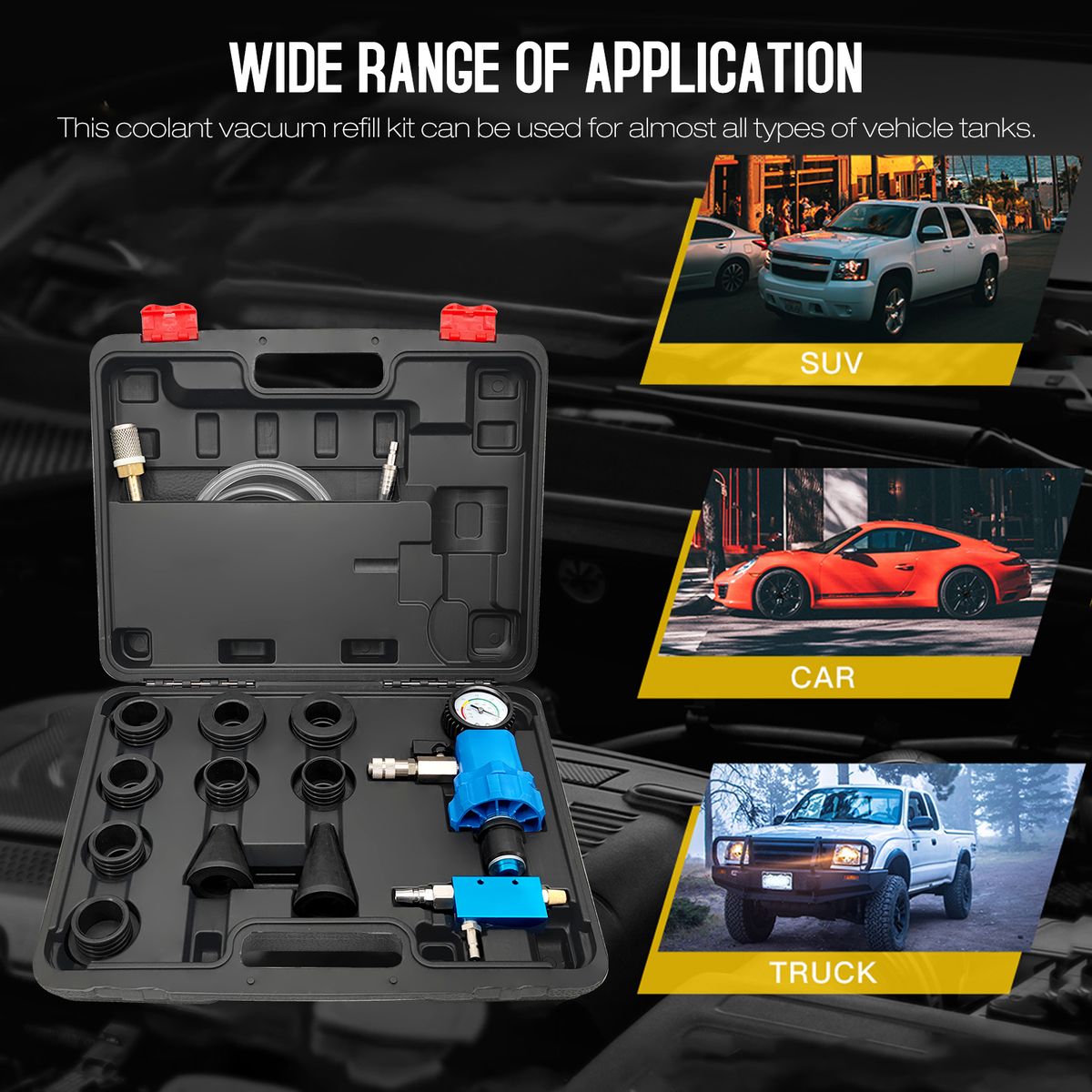 Professional Coolant Vacuum Refill Kit: This kit is designed for vacuum pressure testing and coolant vacuum refilling. The use of this vacuum coolant filler does not require additional air discharge operations, but directly creates a vacuum in the cooling system, which greatly shortens the time for filling coolant and reduces the risk of engine overheating.