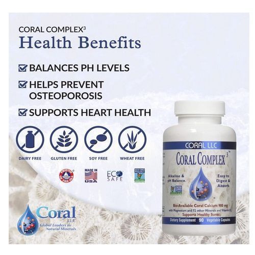 Coral Complex from Coral LLC provides 900 mg of calcium from coral minerals plus 1200 IU of vitamin D3 and 72 trace minerals. These vegetable capsules can help support healthy bones and provide alkaline balance. Gluten free, dairy free, soy free and wheat free.