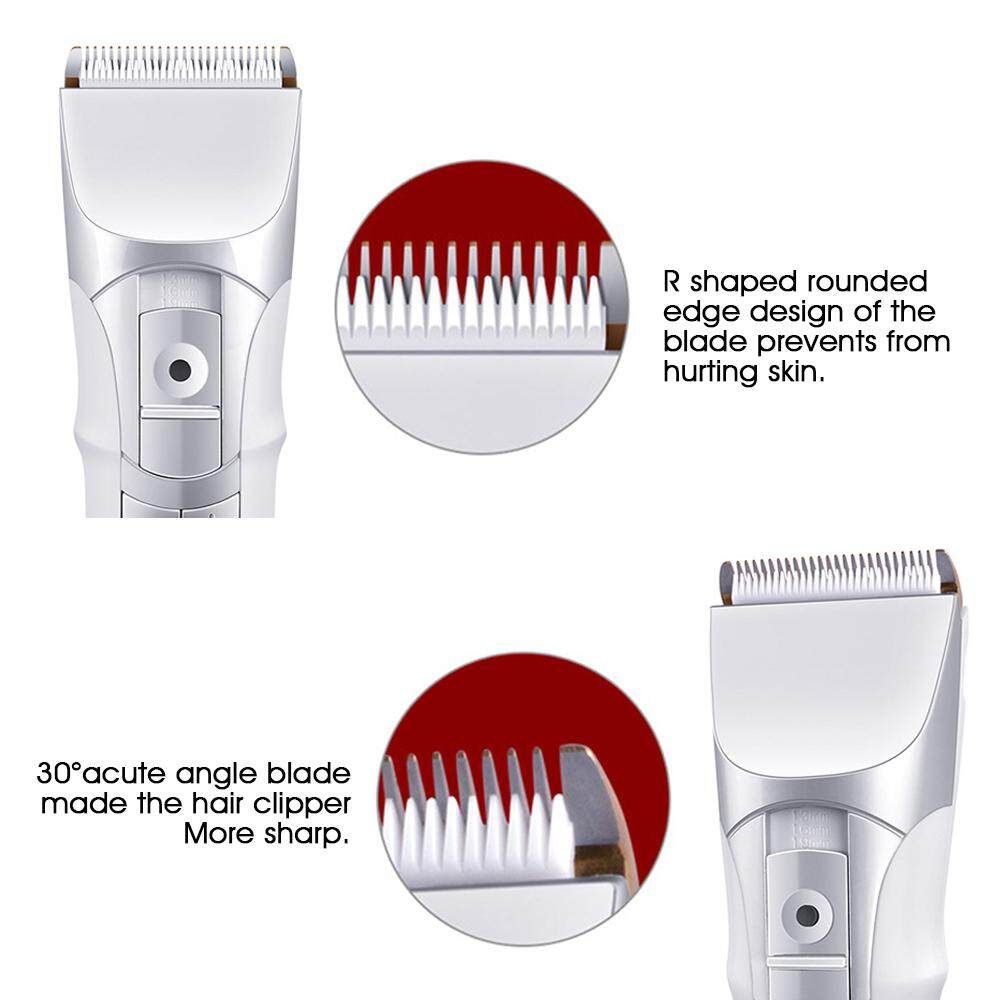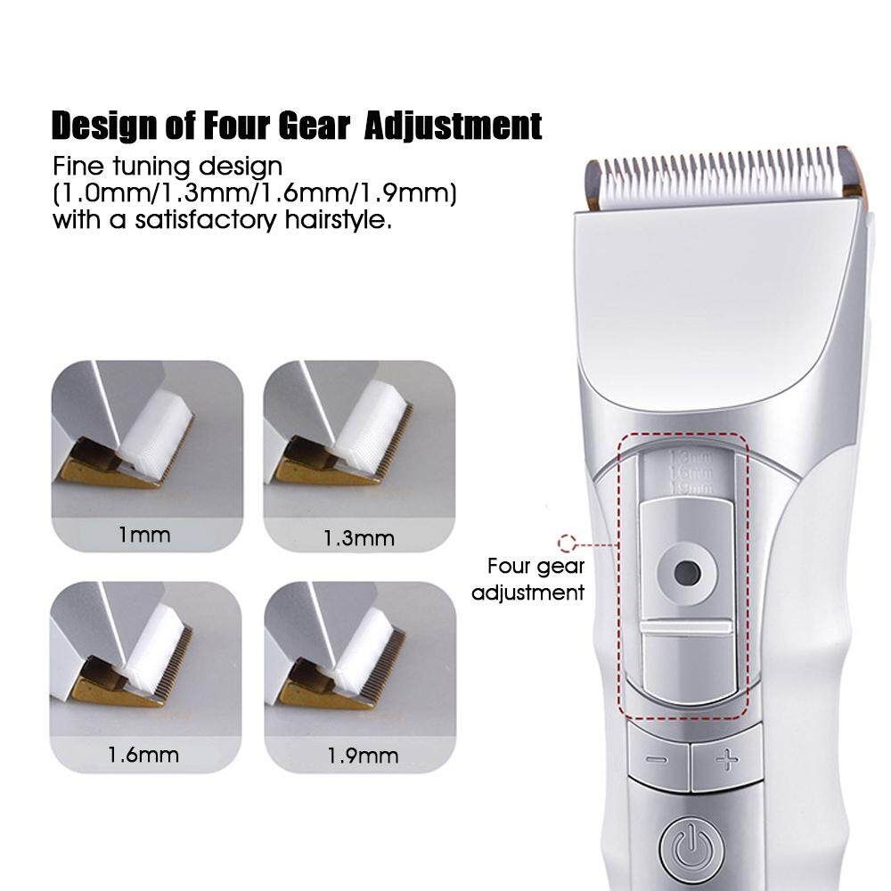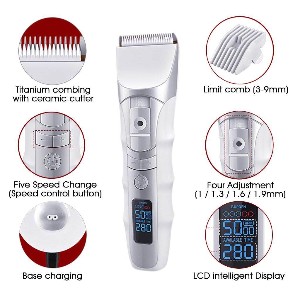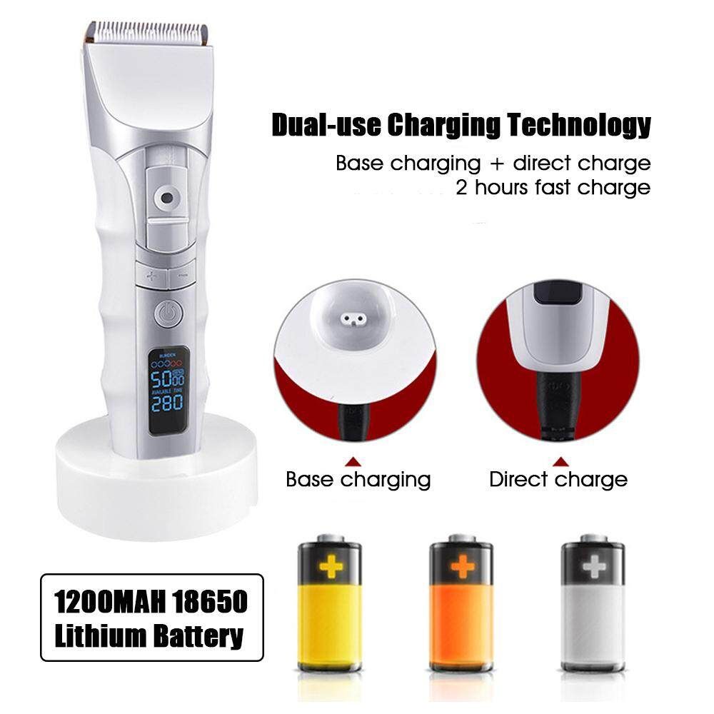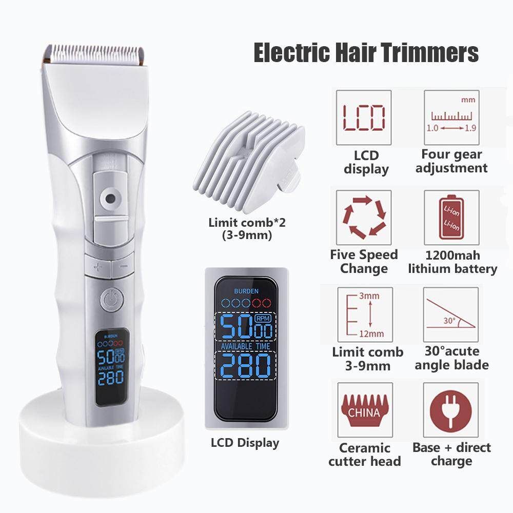 Cord/Cordless Hair Clippers Electric Hair Trimmers For Men Kids and Babies Quiet Home Barber Self Hair Haircut Features: 【Ceramic Head】:This haircut kit's Titanium combining with the ceramic movable for efficient and long term and will not get rusty. R shaped rounded edge design of the prevents from hurting skin, 30°acute angle made the hair clipper More sharp. 【Cordless and Safe】:Cordless Hair Clipper makes you convenient for self hair and safe for wet hair .R-shaped Obtuse Angle Protects yourself from accidental injury, suitable for both adults and children to use safely. 【QuietDesign】:This professional hair clippers have Precision motor, low vibration and Ceramic made friction coefficient smaller, Low noise. 【LCD Intelligent Display】:You can check the speed and the remaining time at any time, and the engine speed can be mastered at any time. It is more convenient to use. 【Fiive Speed Change Four Adjustment】:Adjustable speed (5000/5500/6000/6500/7000 RPM), grasps electricity engine speed; Fine tuning design (1.0mm/1.3mm/1.6mm/1.9mm) with a satisfactory hairstyle. 【1200MAH Batte-ry】:Adopting the current direct charging dual-use charging technology, easy to use. Its Charging time-about 2 hours, working time-200 minutes.The hair clipper can use when charging.Please Note:Due to the shipping restrictions, your package does not include oil. Specifications: Extra : 5W Input : 100V-240V 50/60Hz Batte-ry: 1200mAh batte-ry Charging time: About 2 hours Using time: 200 mins Size: 17.5x4.6cm Package Includeds: 1 x Electric hair clipper(Not include oil) 1 x Limit comb (3-9mm) 1 x Charger 1 x Base 1 x Cleaning brush 1 x Box 1 x Instruction manual