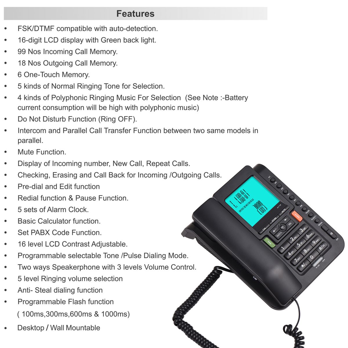 Desktop Landline - It can detect DTMF or FSK caller ID automatically. And 16 Digit LCD/Last Number Redial/99 Incoming Calls (16 digit) Memory/18 Outgoing (12 digit) memory. Support intercom between two parallel phones and transferring the call between parallel phones.